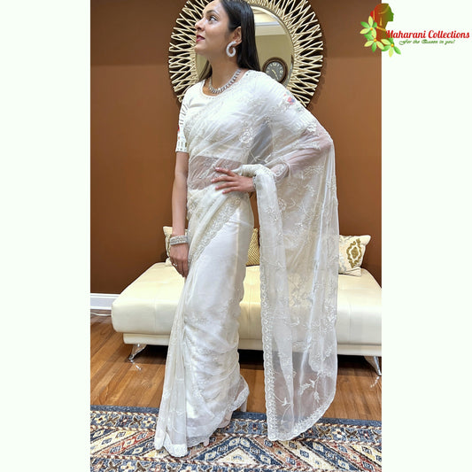 Maharani's Designer Party Wear Georgette Saree - White (with Stitched Petticoat)