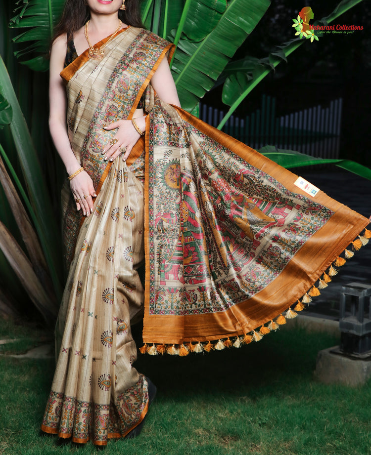 Maharani's Pure Tussar Silk Saree (Silk Mark) - Beige with Madhubani Hand Painting