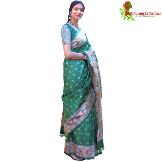 Maharani's Pure Tussar Silk Saree (Silk Mark) - Green with Madhubani Hand Painting