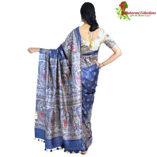 Maharani's Pure Tussar Silk Saree (Silk Mark) - Robin Blue with Madhubani Hand Painting