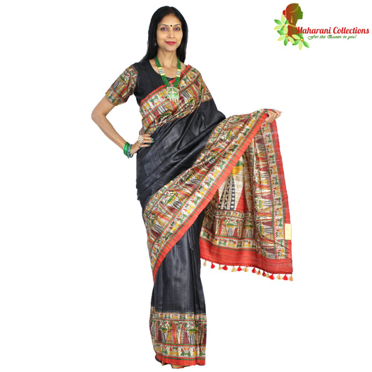 Maharani's Pure Tussar Silk Saree (Silk Mark) - Elegant Black with Madhubani Hand Painting