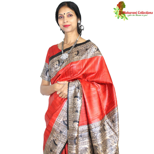 Maharani's Pure Tussar Silk Saree (Silk Mark) - Red & Black with Madhubani Hand Painting