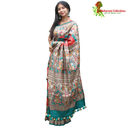 Maharani's Pure Tussar Silk Saree (Silk Mark) - Red & Sea Green with Madhubani Hand Painting