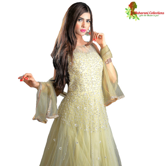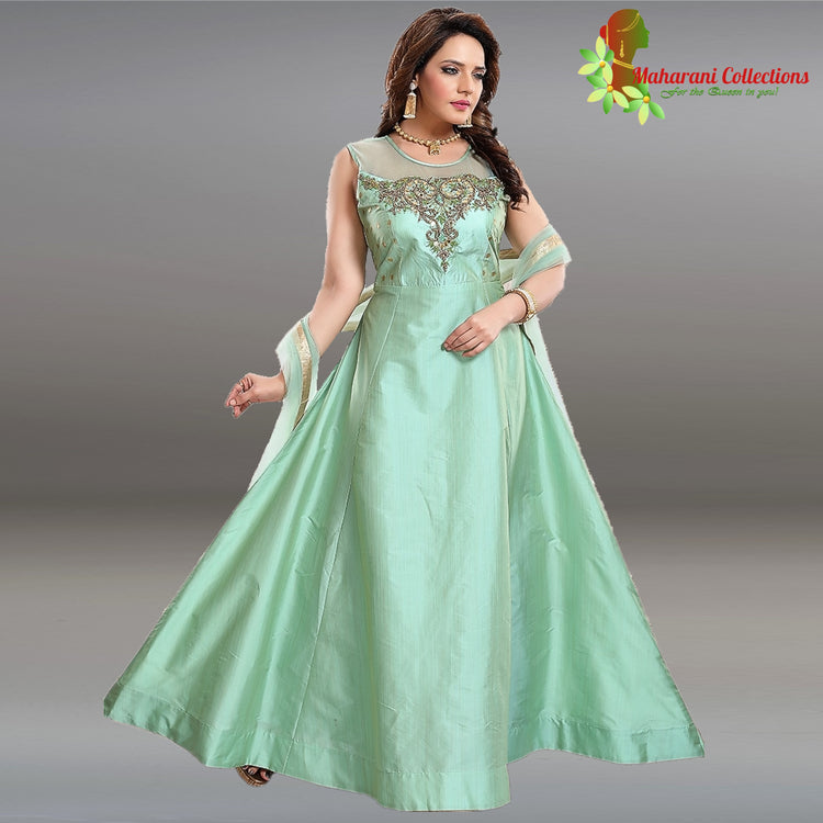 Maharani's Designer Gown (Anarkali Suit) - Pista Green (L) - Tussar Silk