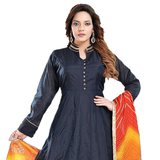 Maharani's Designer Gown (Anarkali Suit) - Navy Blue (L) - Tussar Silk