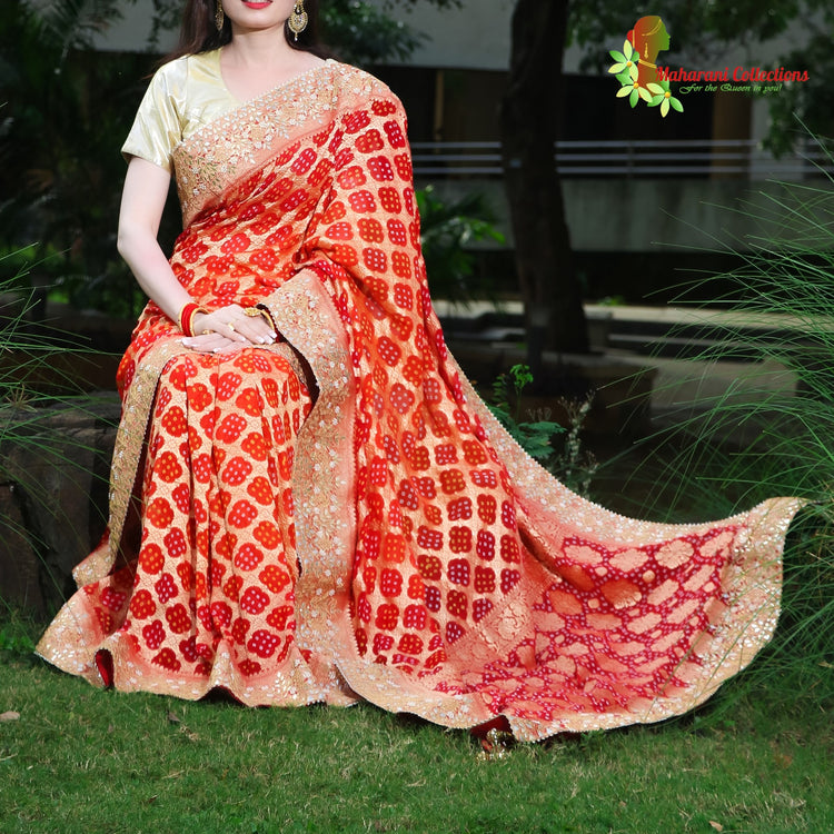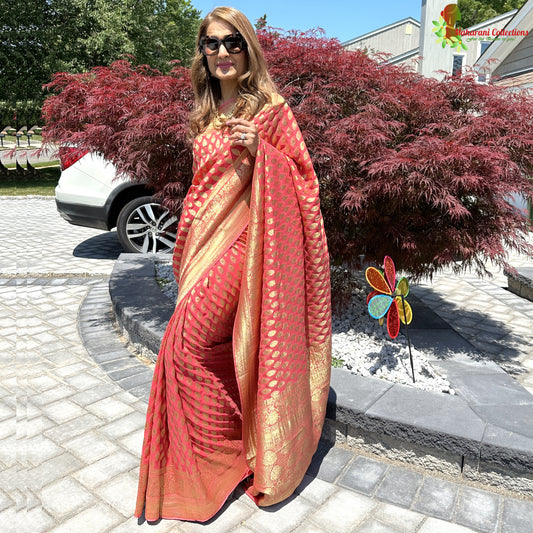 Maharani's Pure Banarasi Khaddi Georgette Saree - Orange (with Stitched Blouse and Petticoat)