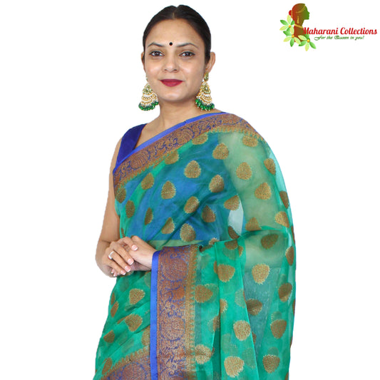 Maharani's Pure Banarasi Silk Saree - Sea Green and Red (with stitched Blouse and Petticoat)