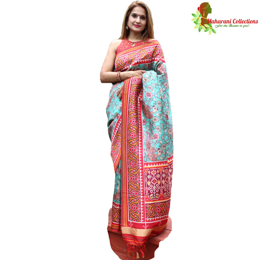 Maharani's Pure Tussar Silk Saree (Silk Mark) - Robin Blue with Madhubani Hand Painting
