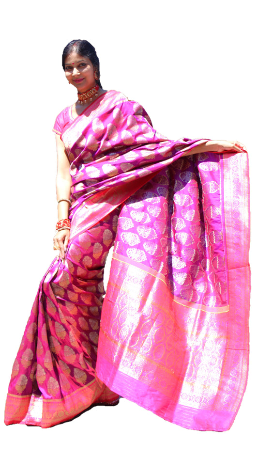 Maharani's Pure Banarasi Silk Saree - Magenta (with stitched Blouse and Petticoat)