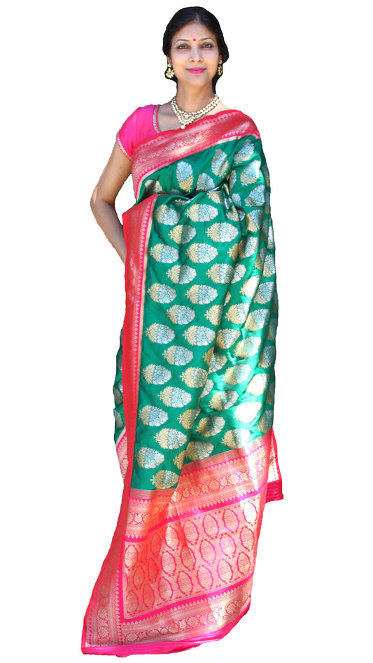 Maharani's Pure Banarasi Silk Saree - Bottle Green (with stitched Blouse and Petticoat)