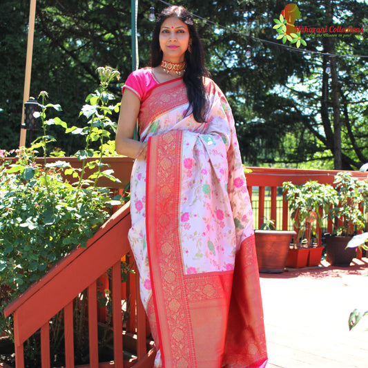 Maharani's Pure Banarasi Silk Saree - Cream (with stitched Blouse and Petticoat)