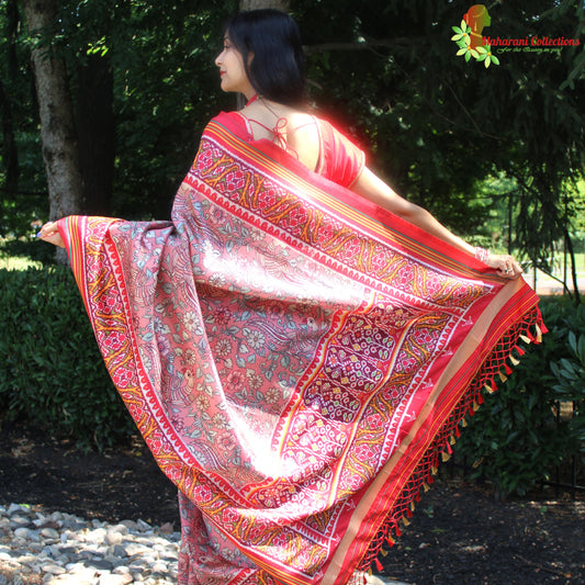 Maharani's Pure Tussar Silk Saree (Silk Mark) - Red & Sea Green with Madhubani Hand Painting
