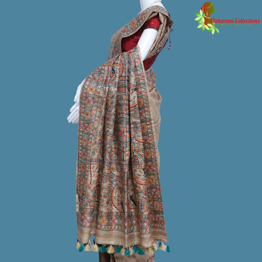 Pure Bhagalpur Tussar Silk Saree (Silk Mark) - Beige Madhubani Work