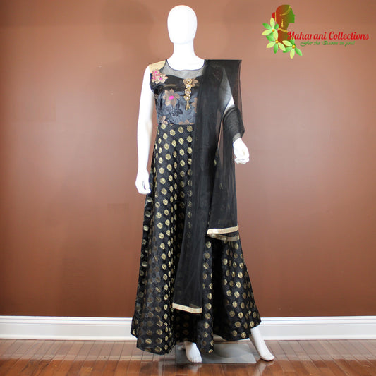 Maharani's Designer Gown (Anarkali Suit) - Black (L) - Banarasi Silk
