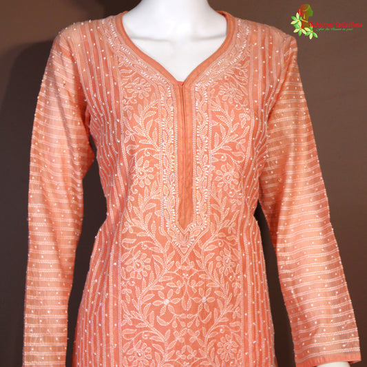 Maharani's Lucknowi Chikankari Pant Suit - Peach (L) - Chanderi Silk