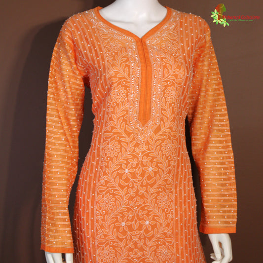 Maharani's Lucknowi Chikankari Pant Suit - Orange (XL) - Chanderi Silk