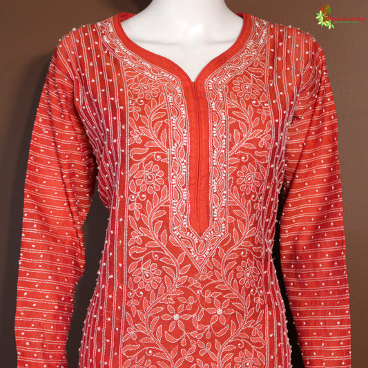 Maharani's Lucknowi Chikankari Pant Suit - Red (L) - Chanderi Silk