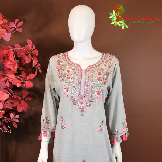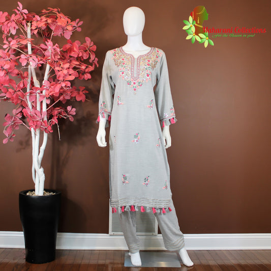 Maharani's Suit with Pants and Dupatta - Grey (L) - Pure Muslin Silk