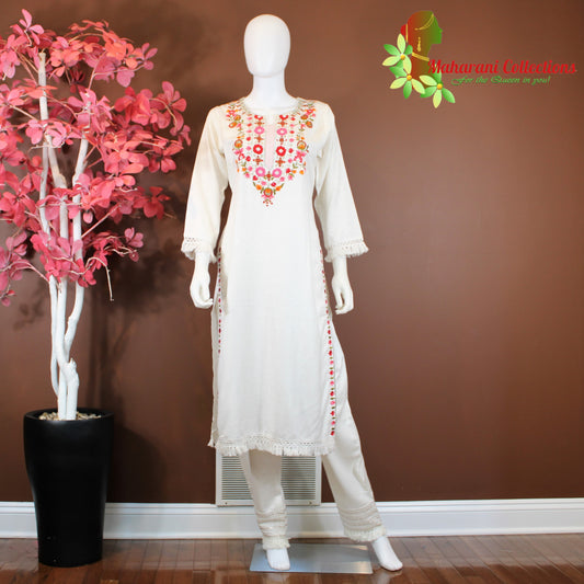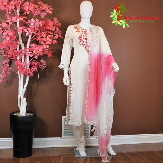 Maharani's Suit with Pants and Dupatta - Light Cream (M) - Pure Muslin Silk