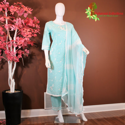 Maharani's Suit with Pants and Dupatta - Sea Green (L) - Pure Muslin Silk