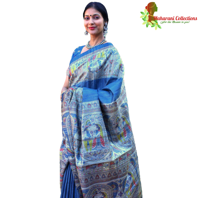 Maharani's Pure Tussar Silk Saree (Silk Mark) - Robin Blue with Madhubani Hand Painting