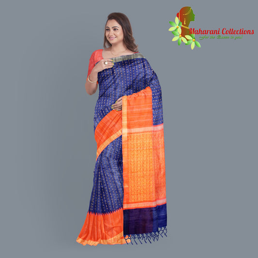 Pure Tussar Silk Saree (Silk Mark) - Navy Blue (with Stitched Blouse & Petticoat)