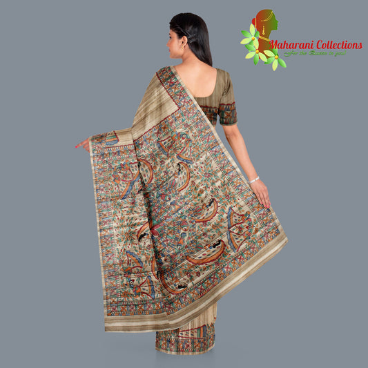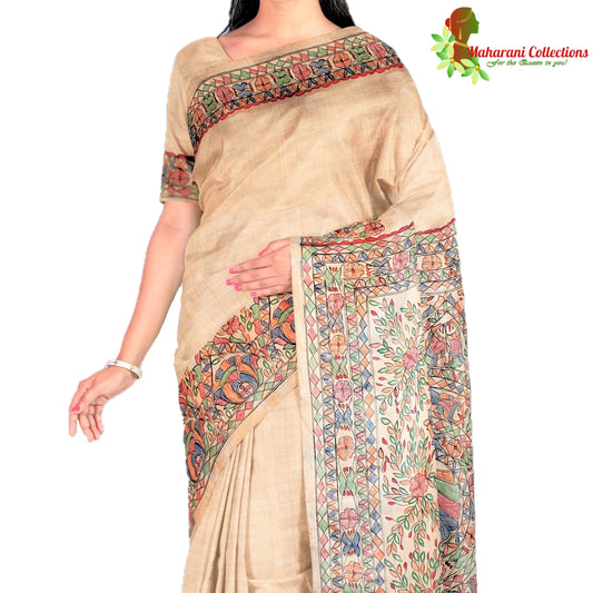 Pure Bhagalpur Tussar Silk Saree (Silk Mark) - Beige with Madhubani Hand Painting (includes Stitched Blouse & Petticoat)