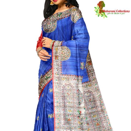Pure Tussar Silk Saree (Silk Mark) - Robin Blue - Madhubani Hand Painting (with Stitched Blouse & Petticoat)