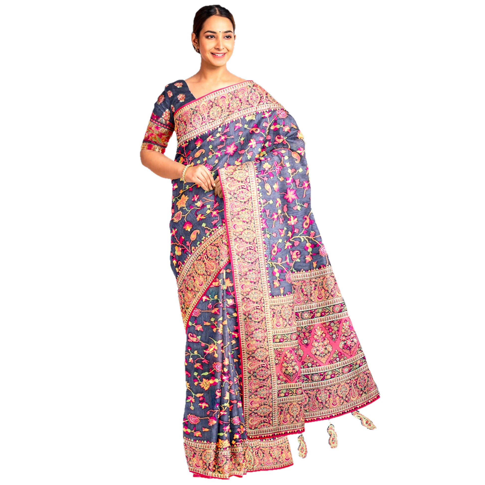 Maharani's Pure Banarasi Jamdani Silk Saree - Purple (with stitched blouse and petticoat)