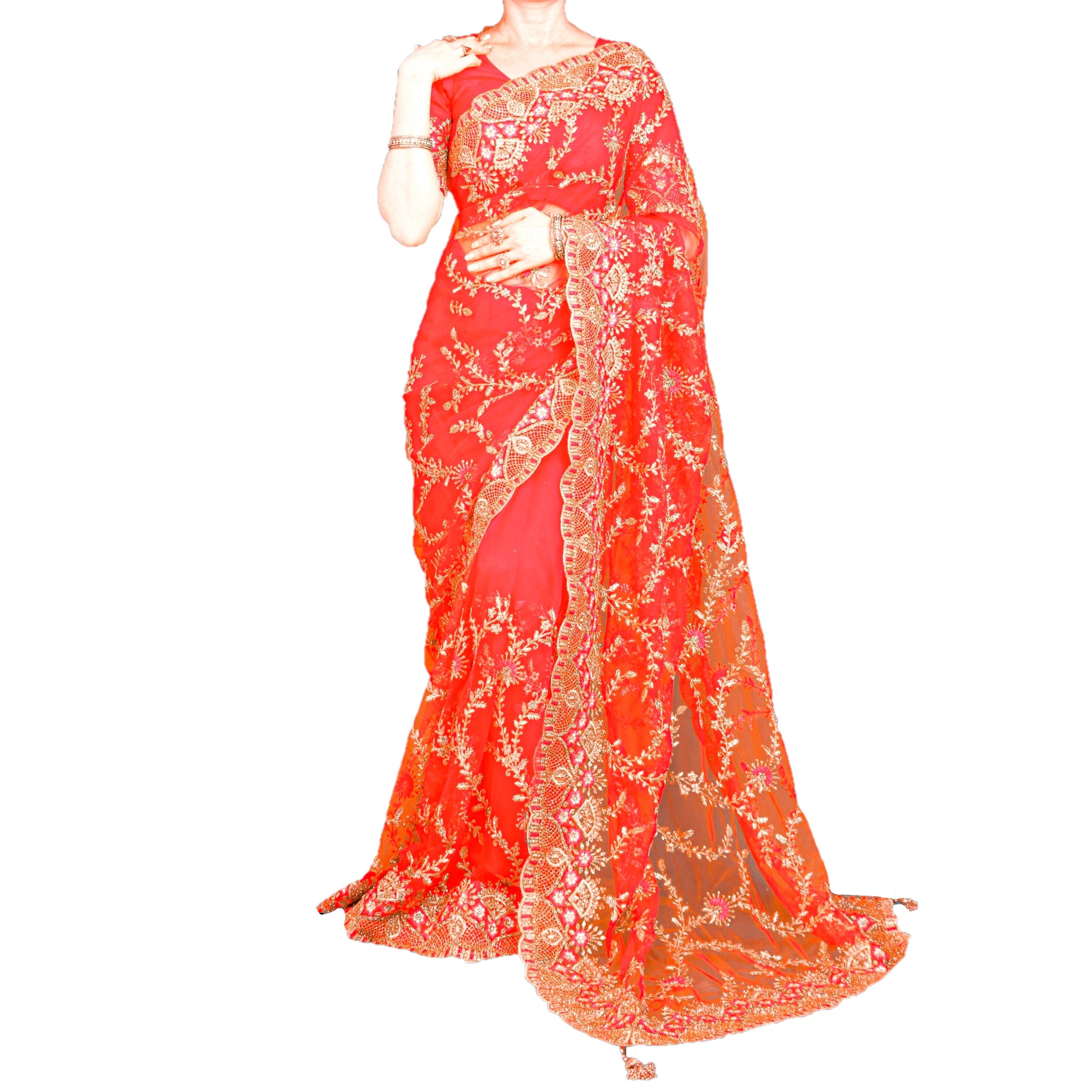 Bridal Red Net and Georgette, heavily embroidered saree with Zari and colored silk thread (Resham) work. Comes with ready-to-wear stitched blouse and ready-to-wear petticoat. All stitching is done as per Maharani's specification with original and authentic material.
