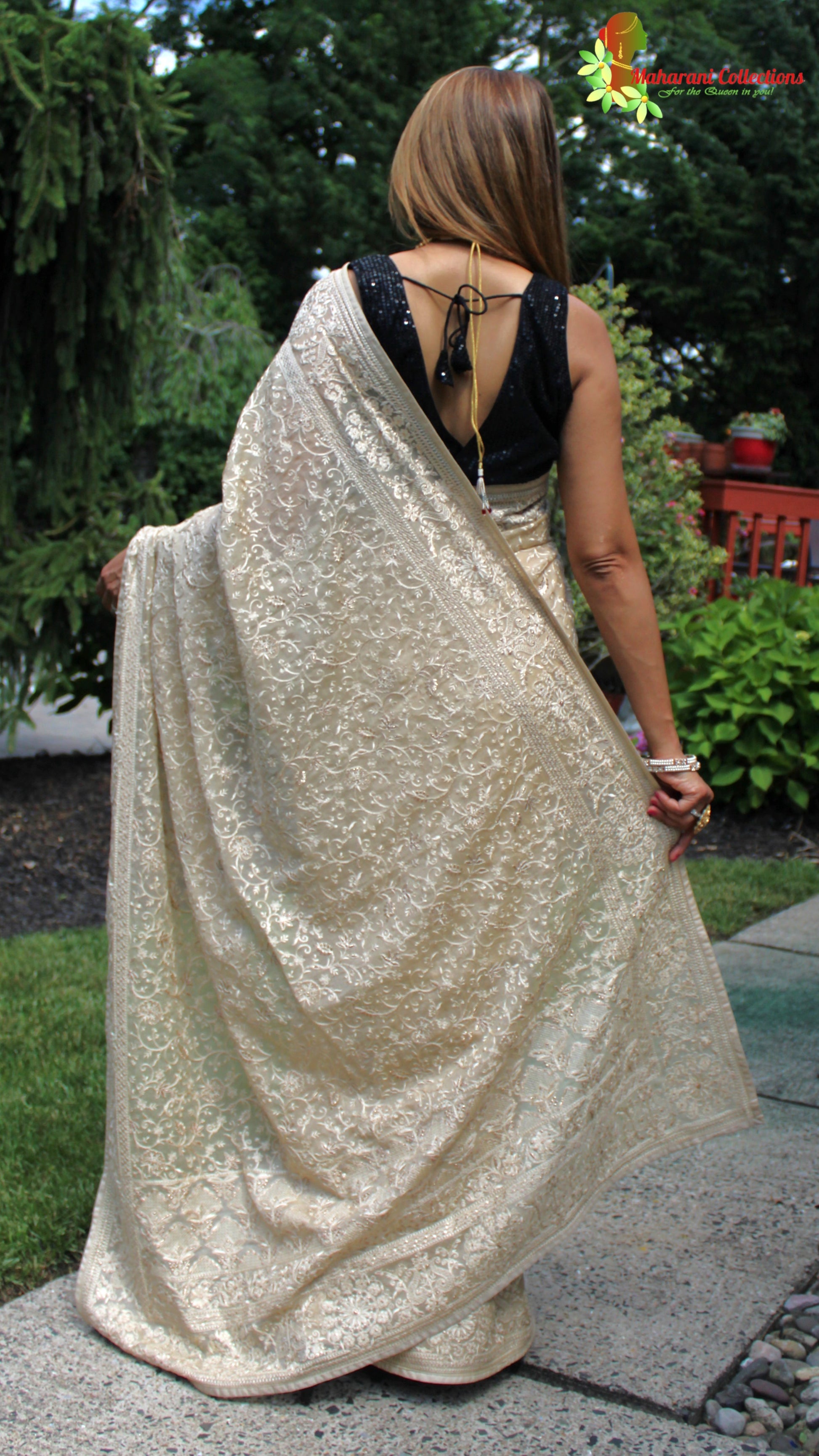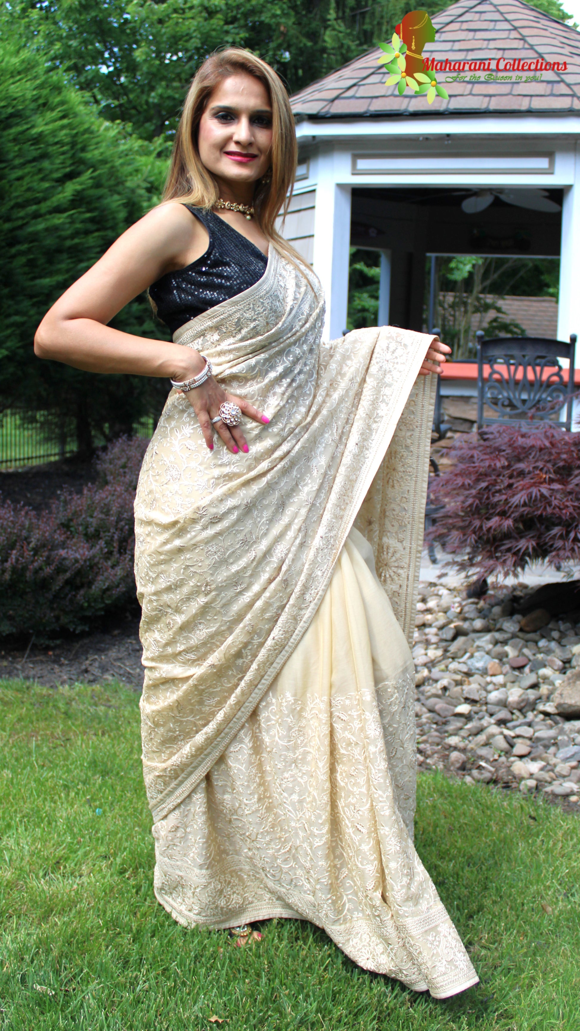 Maharani's Party Wear Georgette Heavy Zari Saree - Beige (with Stitched Blouse and Petticoat)