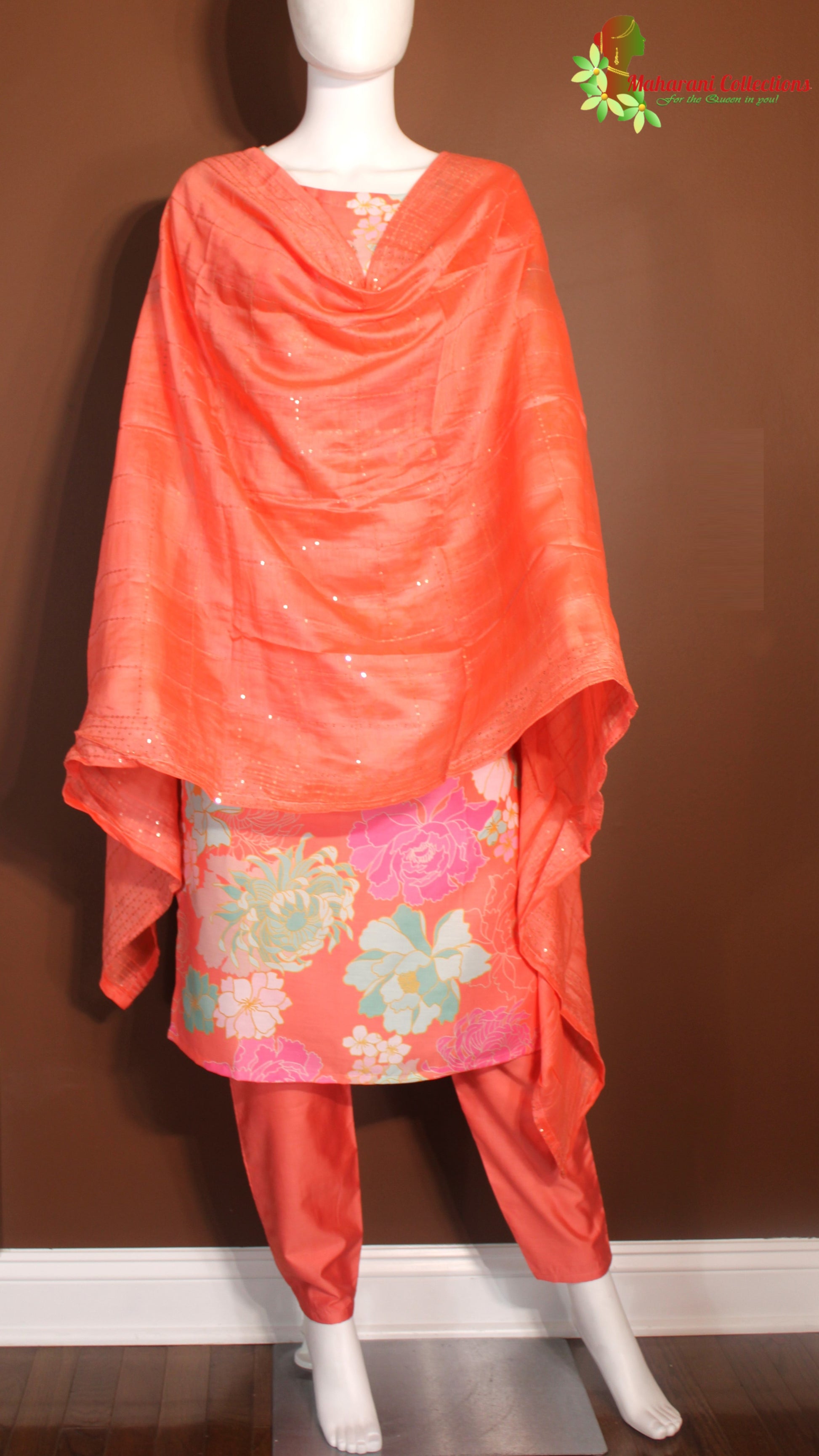 Maharani's Pant suit with Stitched Liner, Floral Prints, Thread and Zari Work, matching Pant and Silk, Sequins Work Dupatta.