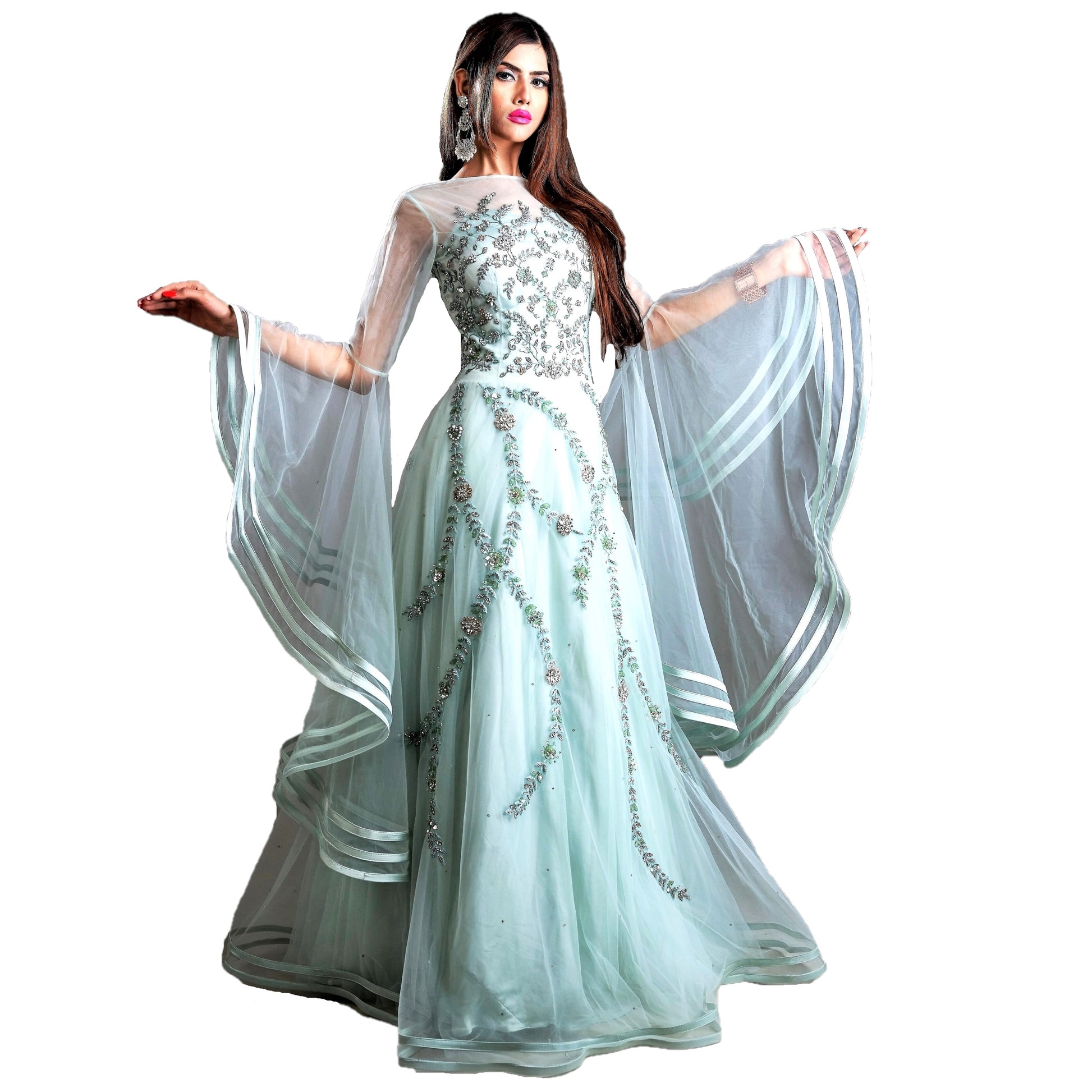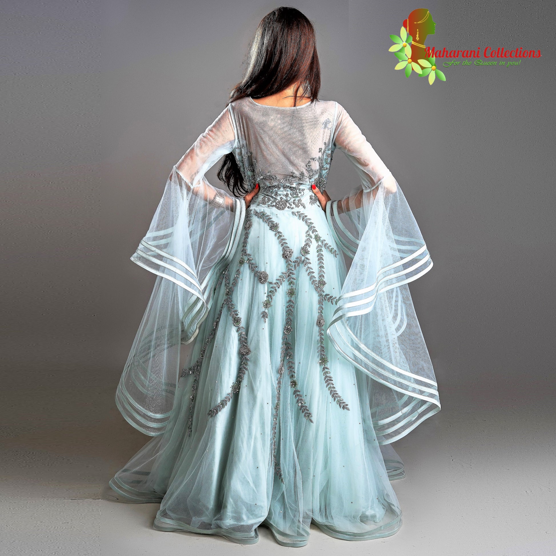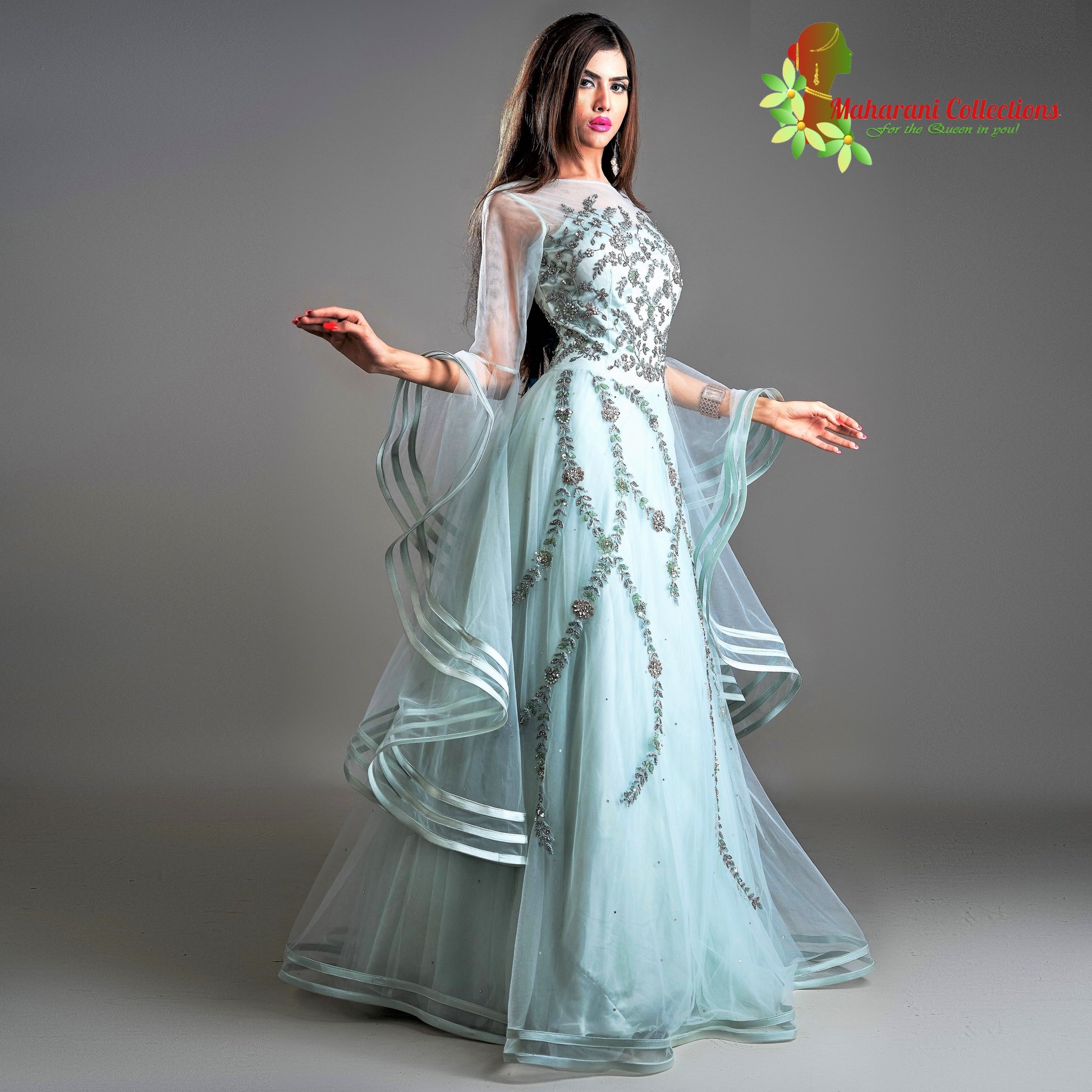 Designer Ball (Princess) Gown - Light Sea Green with Net, Beads, Sequins and Thread Work