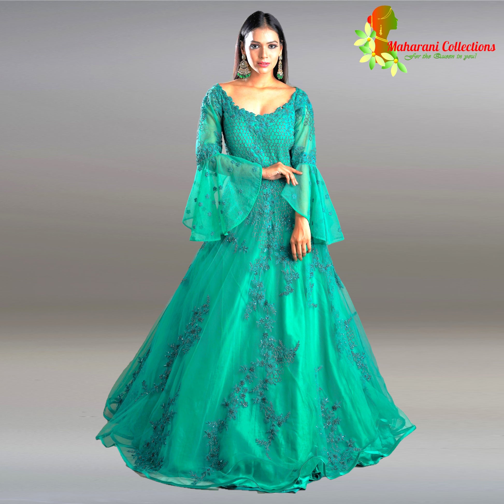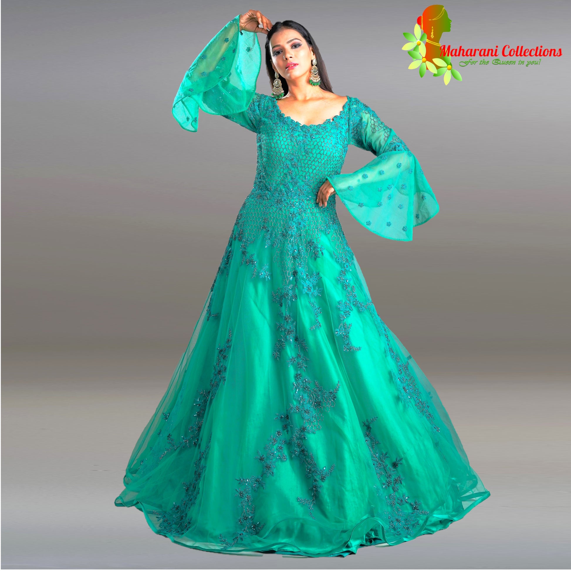 Maharani's Designer Ball (Princess) Gown - Dark Green with Net, Beads, Sequins and Thread Work