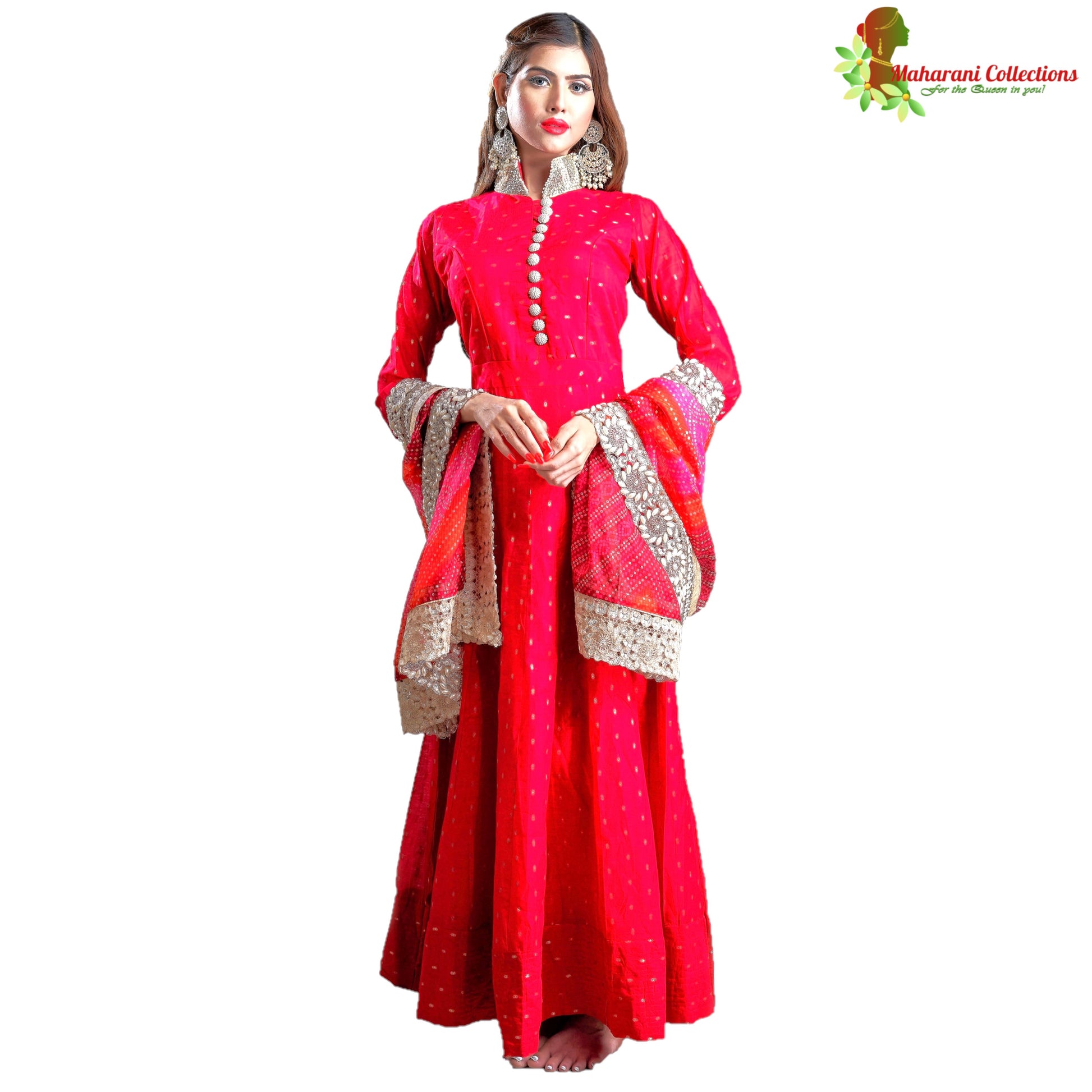 Maharani's designer A-line Gala gown, designed for Western Ball/Gala events while presenting the elegance of an Indian Maharani – a unique blend of best of Indian fashion art and fabric with western design. Comes with a matching detailed stonework dupatta.