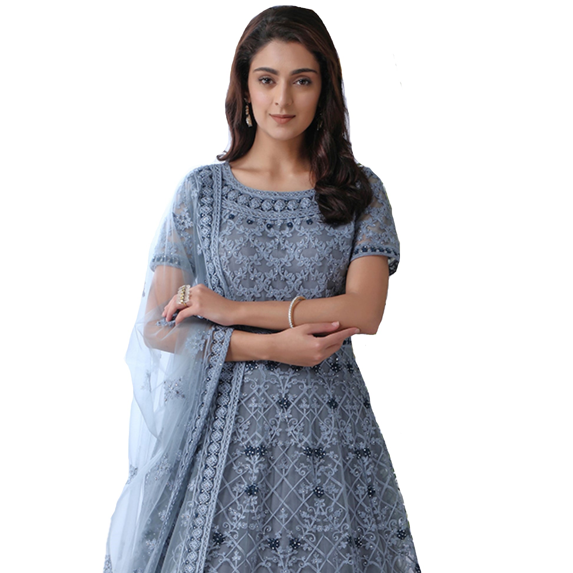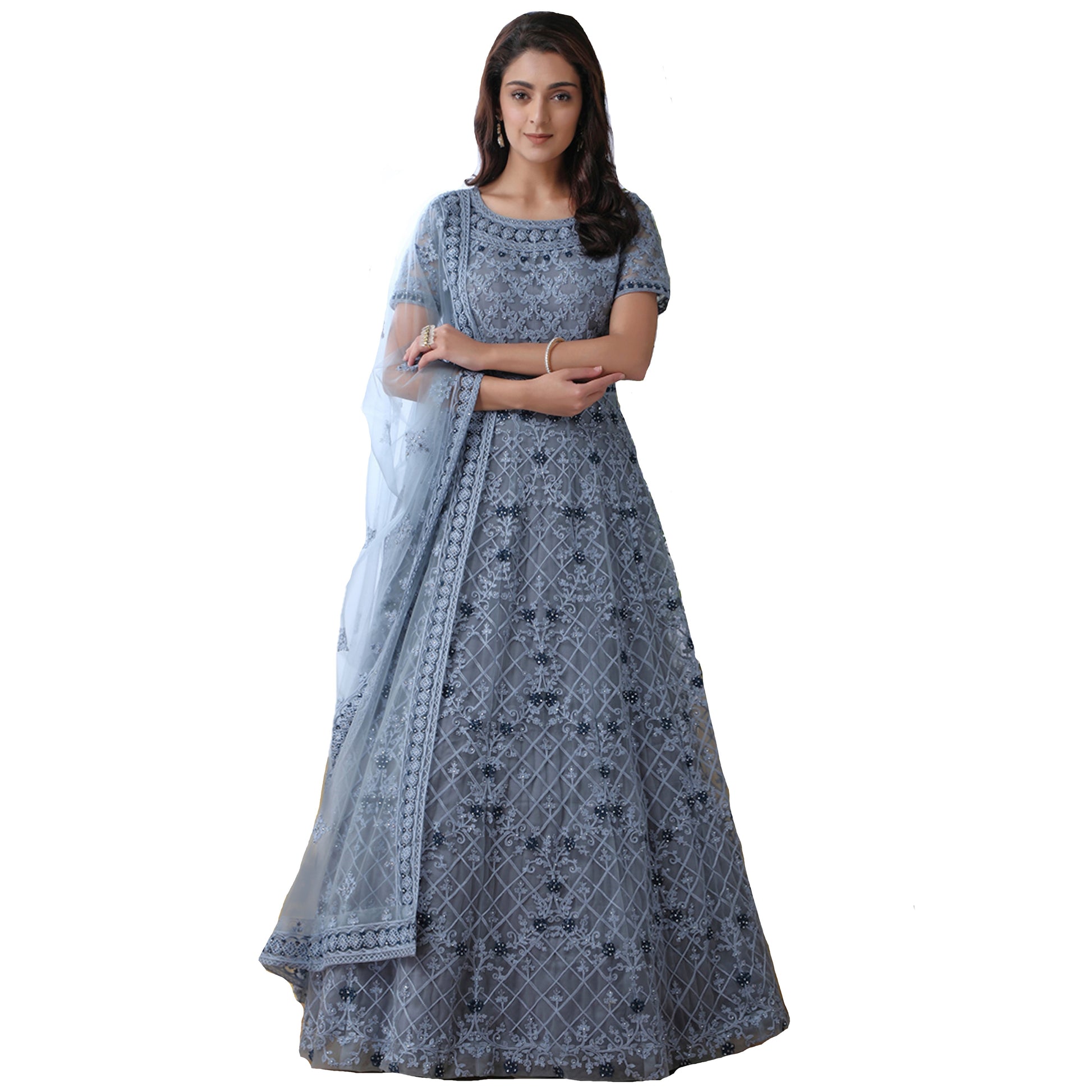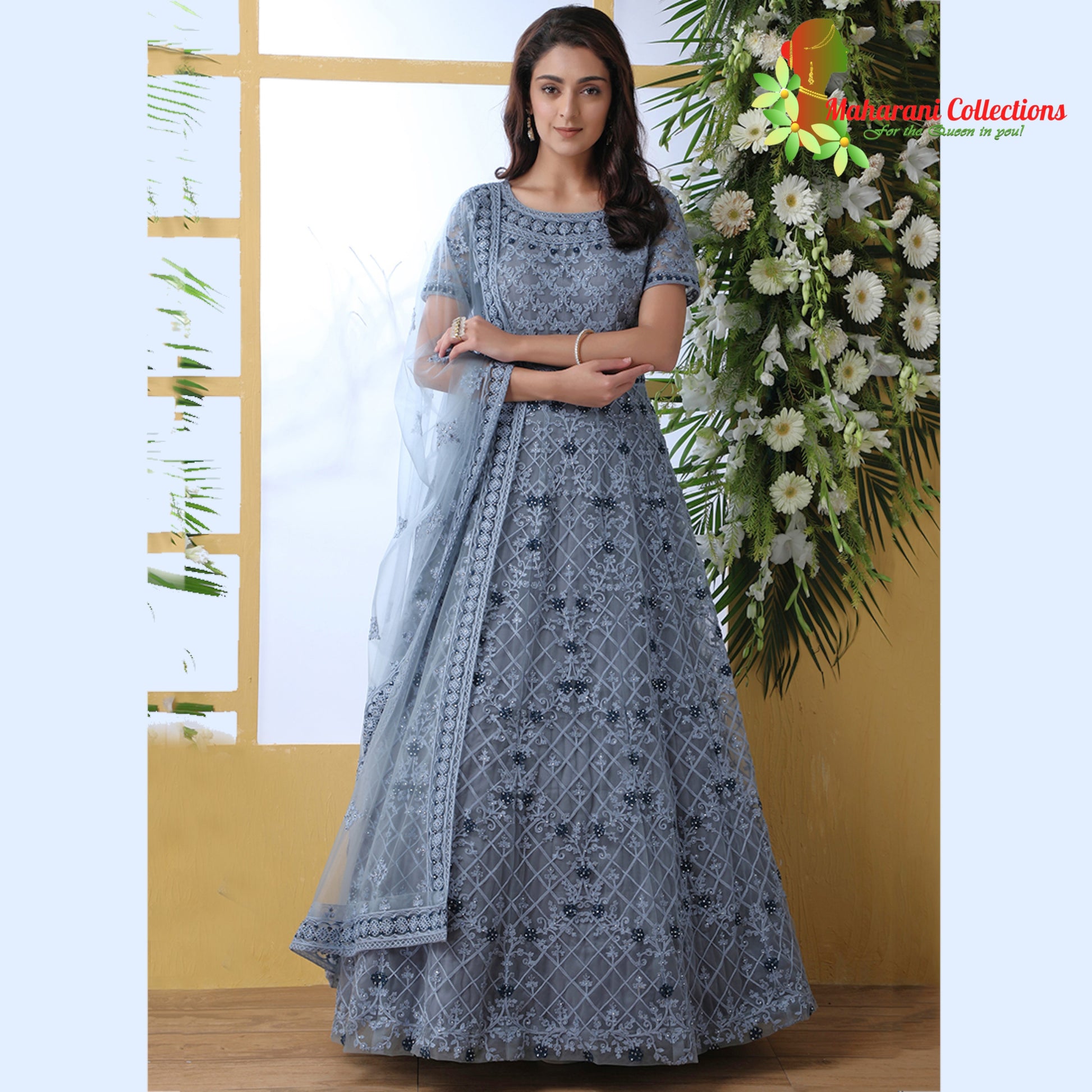 Maharani's Designer Gala Gown - Bluish Grey with Exquisite Thread and Stonework