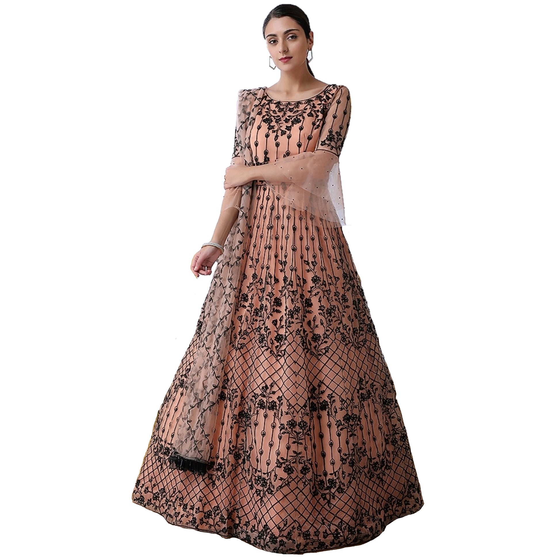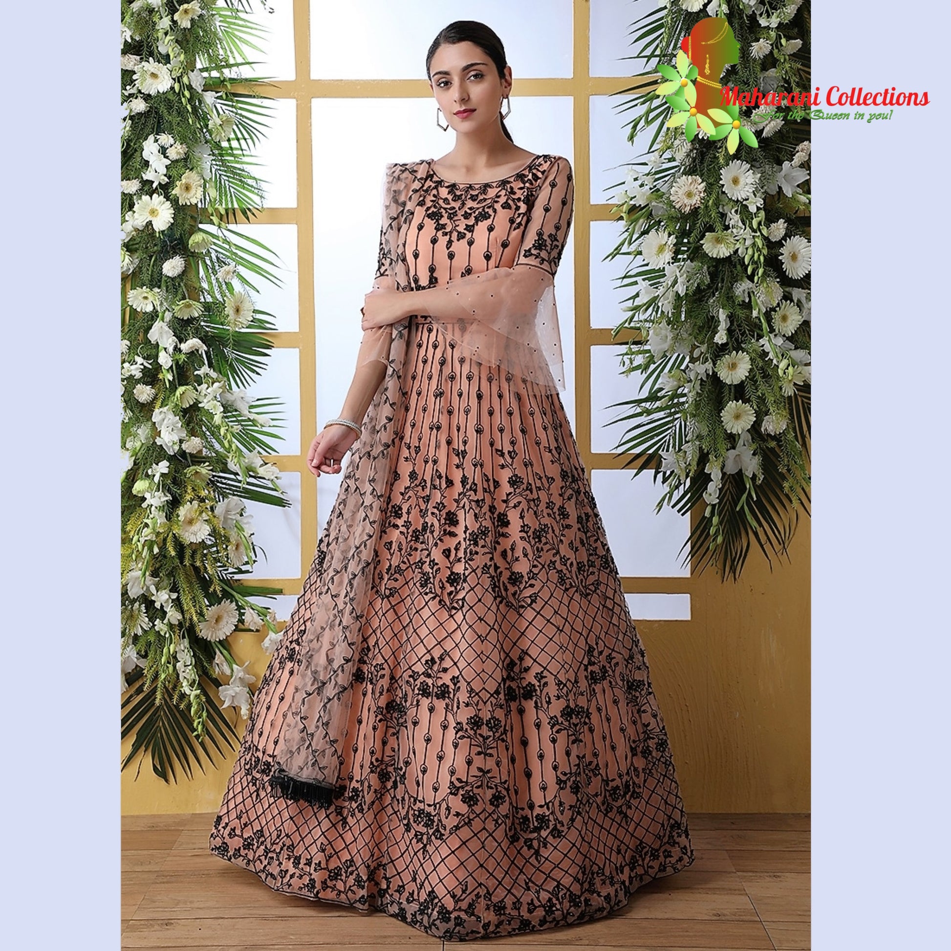 Maharani's Designer Gala Gown - Peach and Black with Exquisite Thread Work