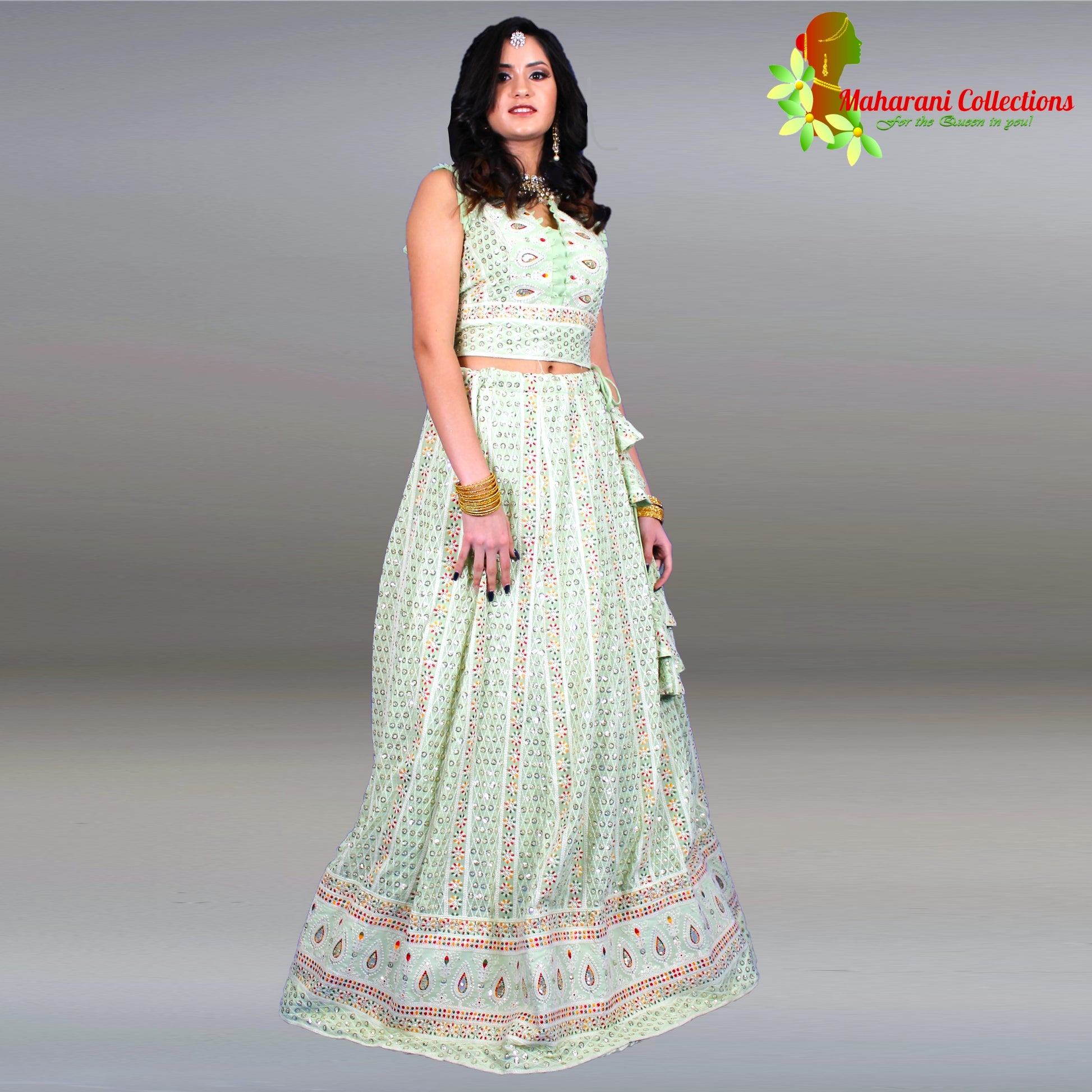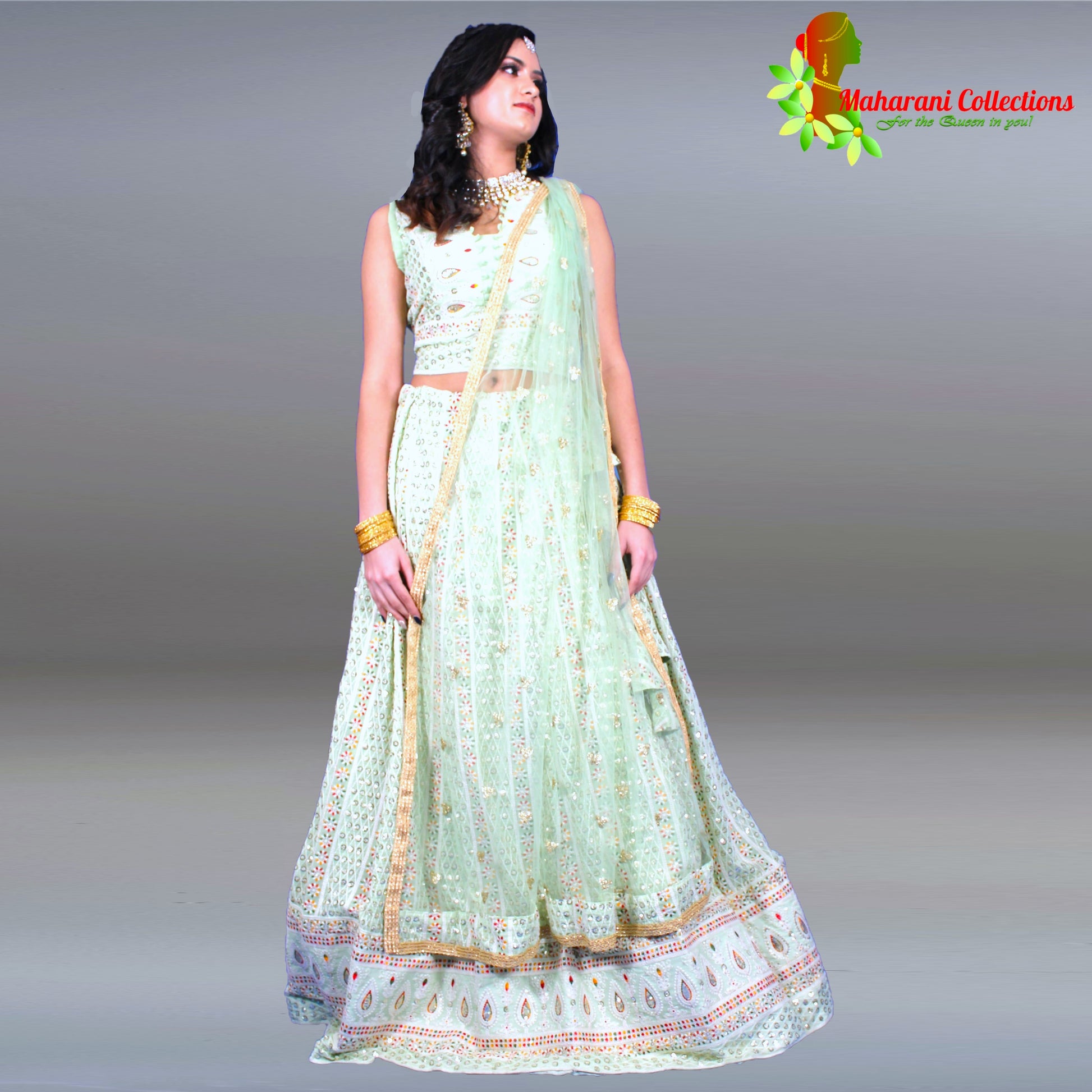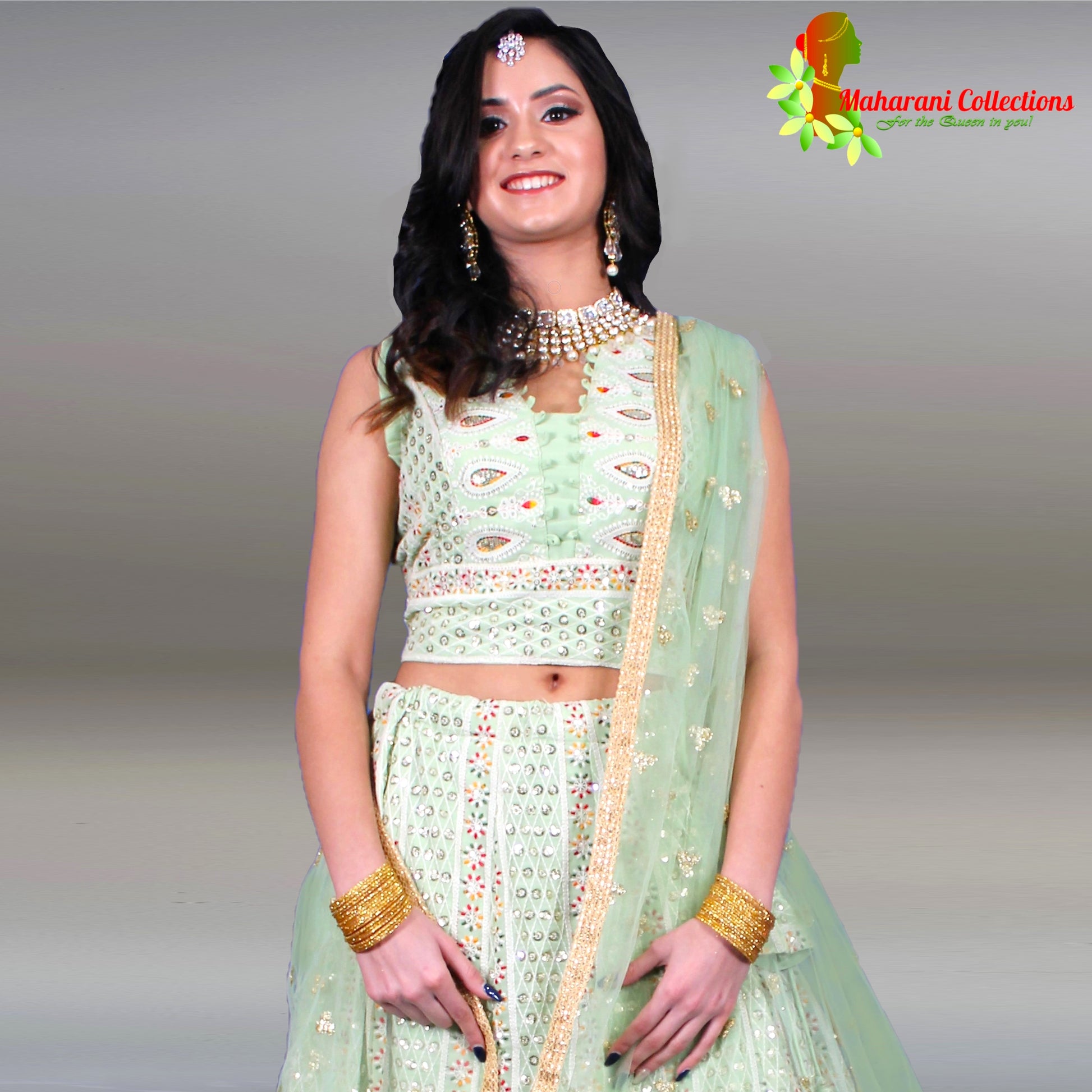 Maharani Collections presents this designer light sea green Lehenga Choli, crafted with elegant silk and intricate Zari and Sequins embroidery, and accompanied by a matching stitched Choli and a luxurious, heavily embroidered net dupatta with Gotta-Patti border. Be party-ready in this stunning ensemble.