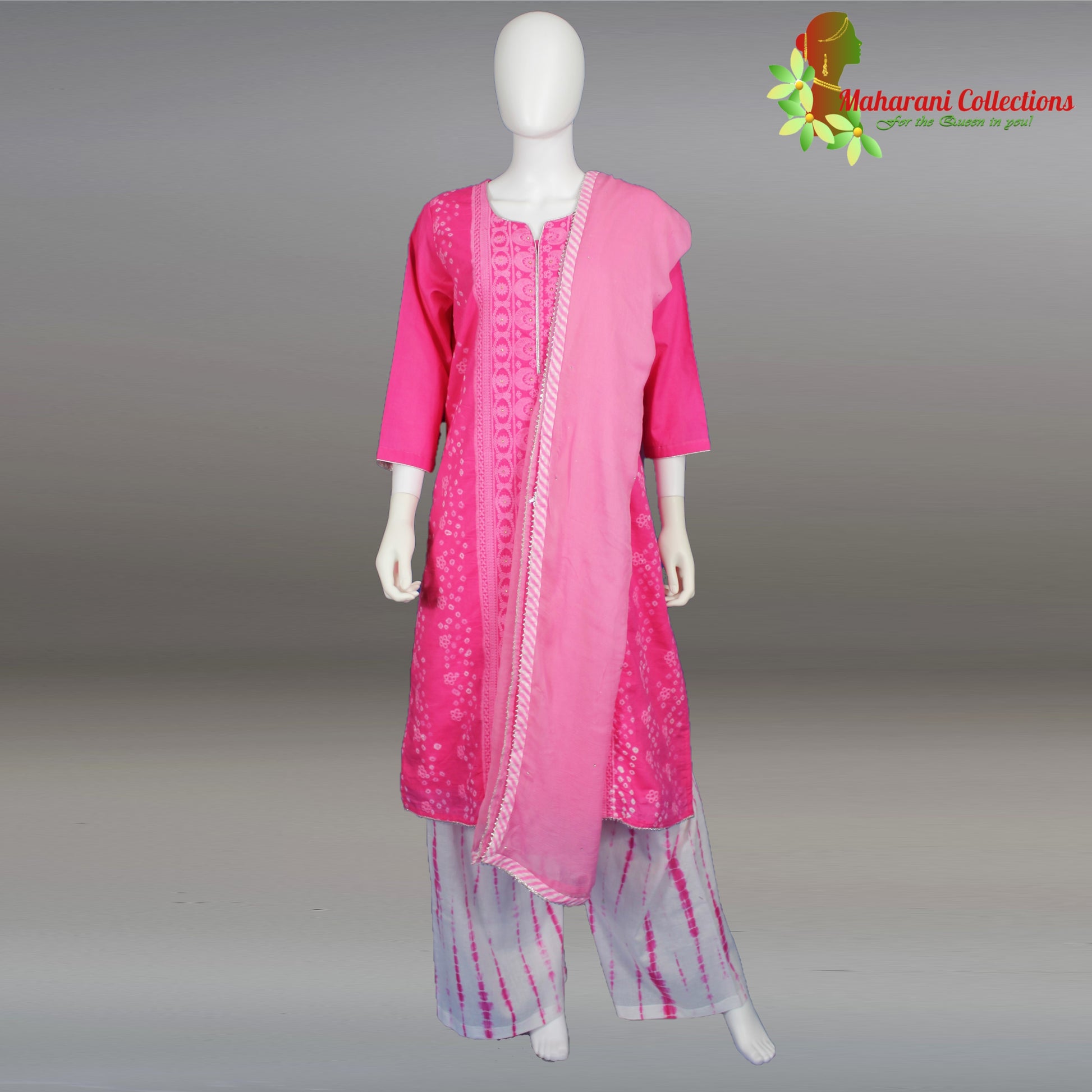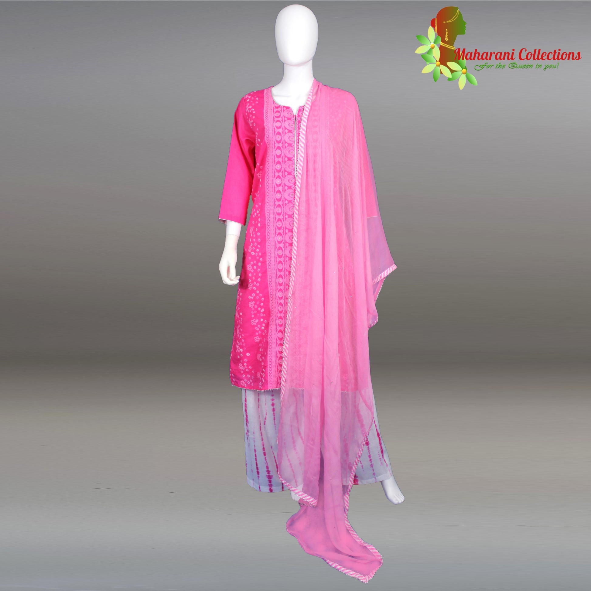 Maharani's Palazzo Suit with Silk Liner, threadwork and Bandhej Prints, matching Pant and Pink Color, Georgette and Gotta Patti Lace Border Dupatta.