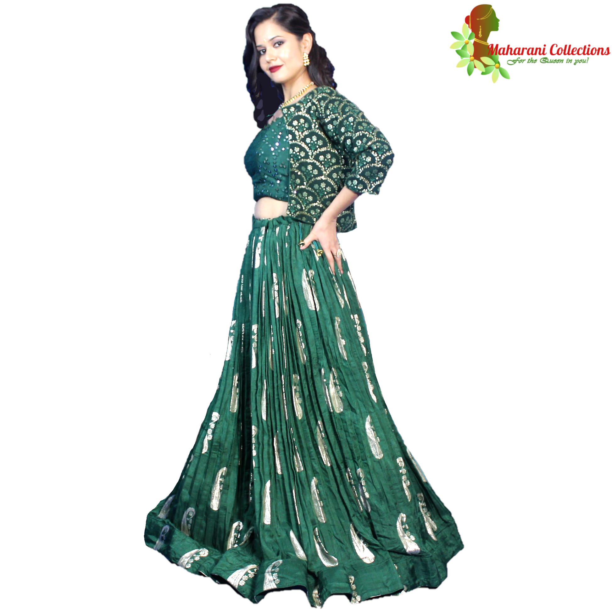 Look stunning in this beautiful Maharani's Silk Ikkat Patola Lehenga Choli with Half Koti! The Bottle Green Lehenga featuring large Zari Boota work and the embroidered readymade Mirror Work Choli are exquisitely stylish, with detailed mirror work throughout. Capture the spotlight in this gorgeous Lehenga.