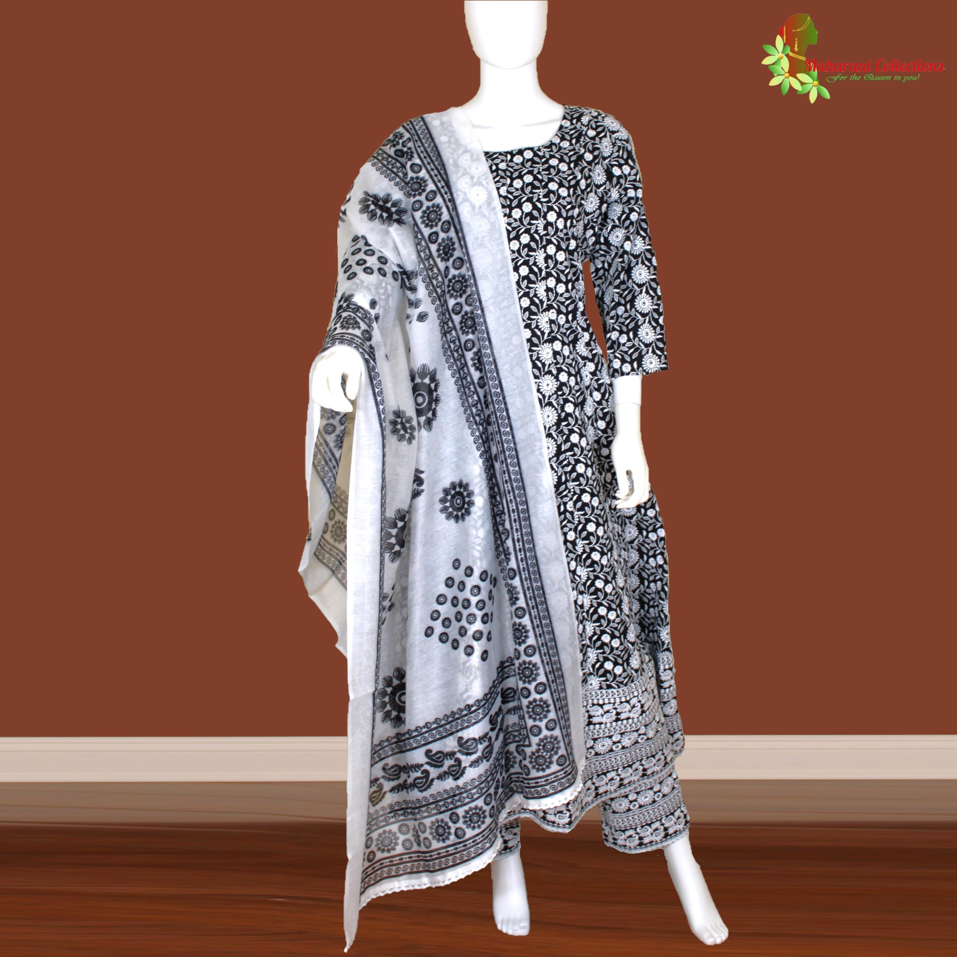 Maharani's Anarkali Suit - Black and White (XL) - Pure Cotton