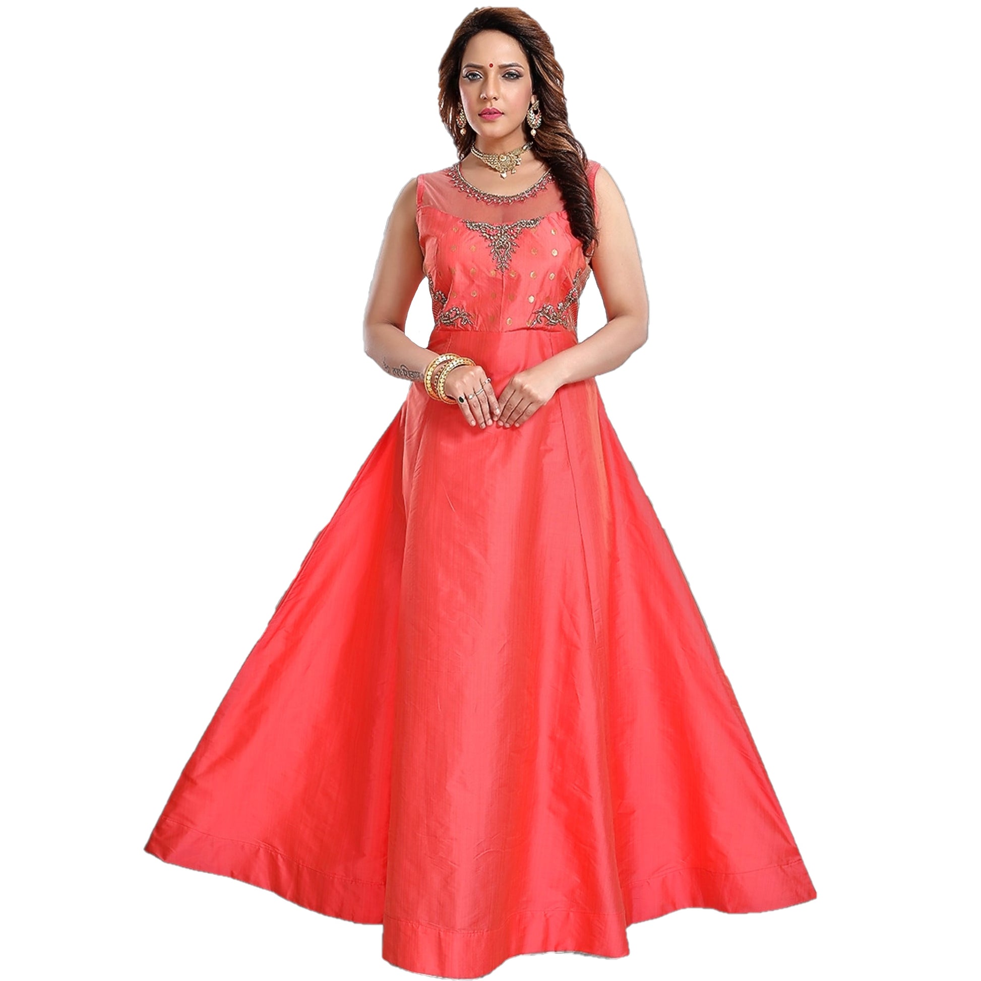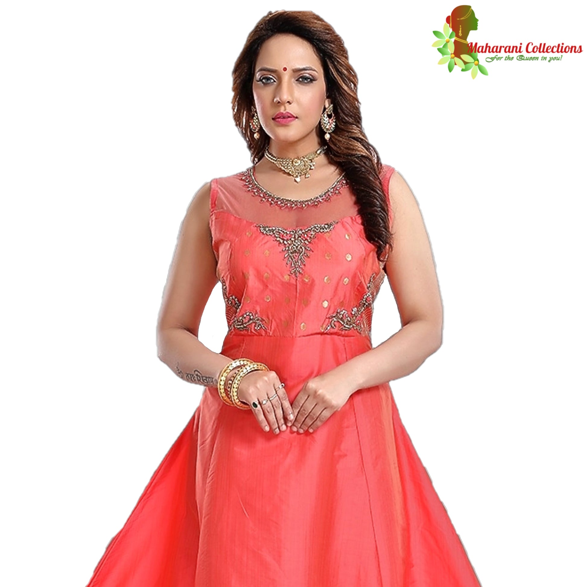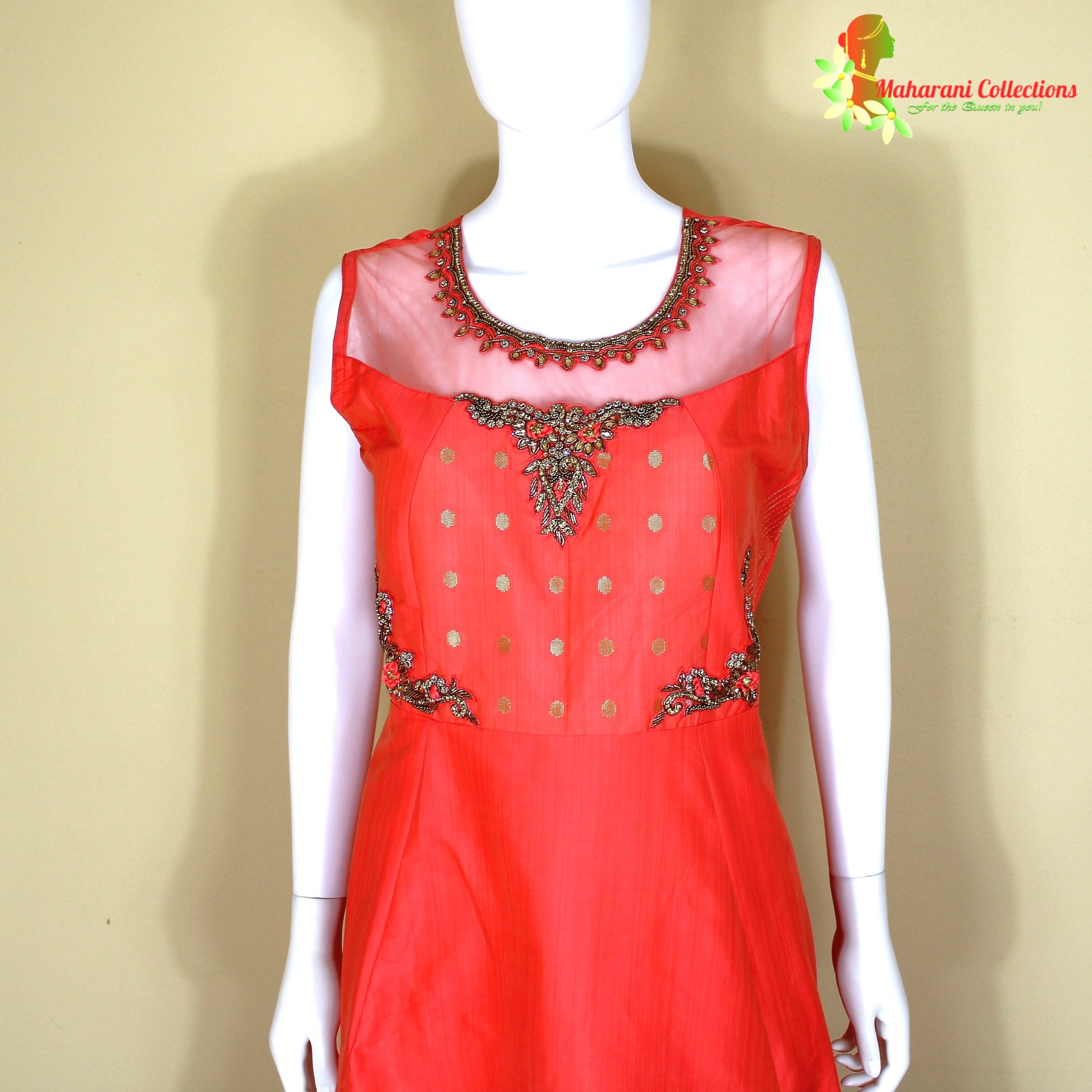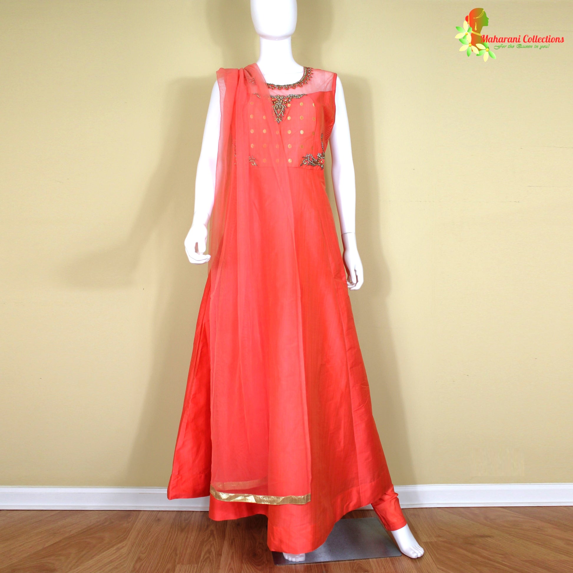 Maharani's Designer Gown (Anarkali Suit) - Dark Orange (L) - Tussar Silk