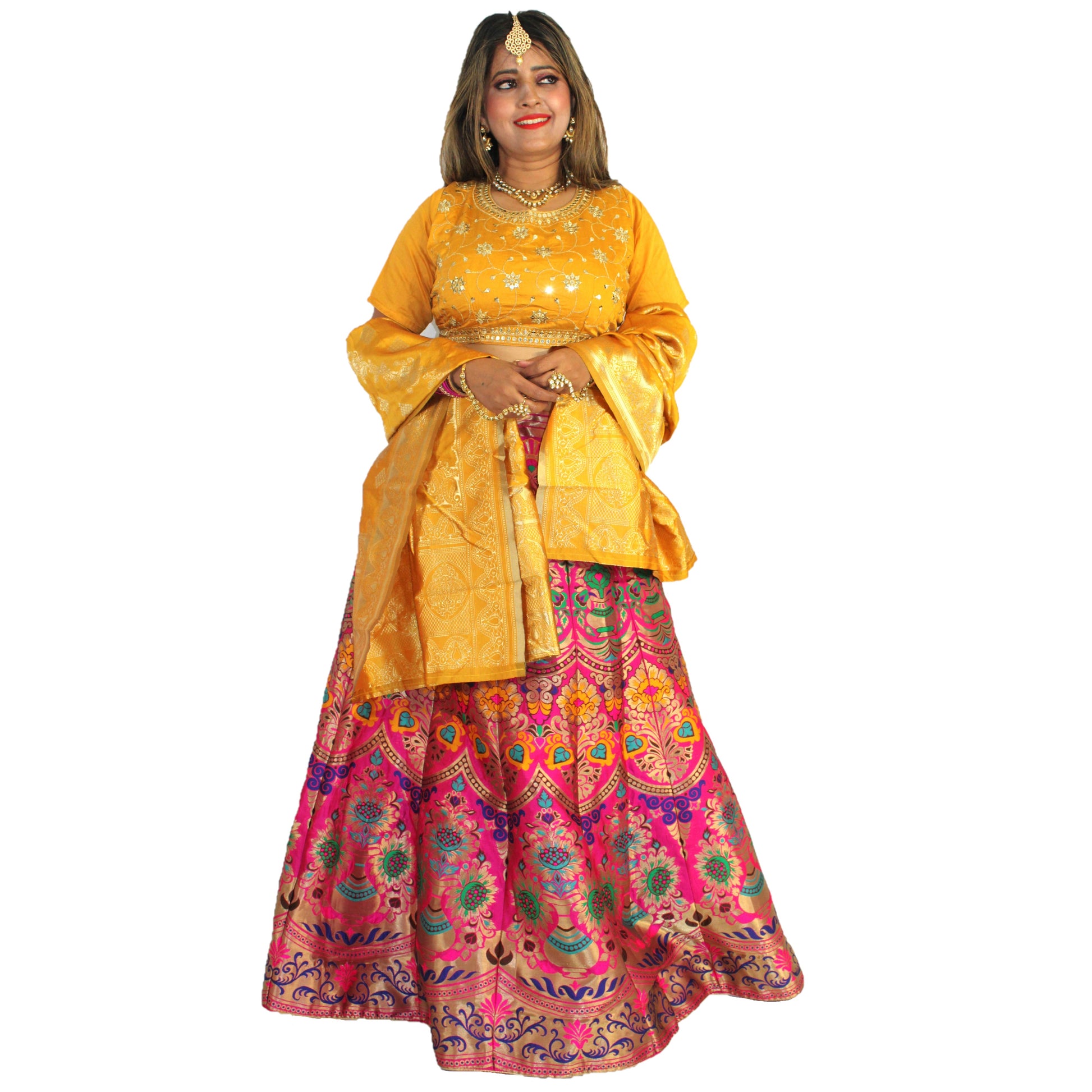 Maharani's Designer Pure Banarasi Silk Lehenga - Yellow and Pink (M/L)