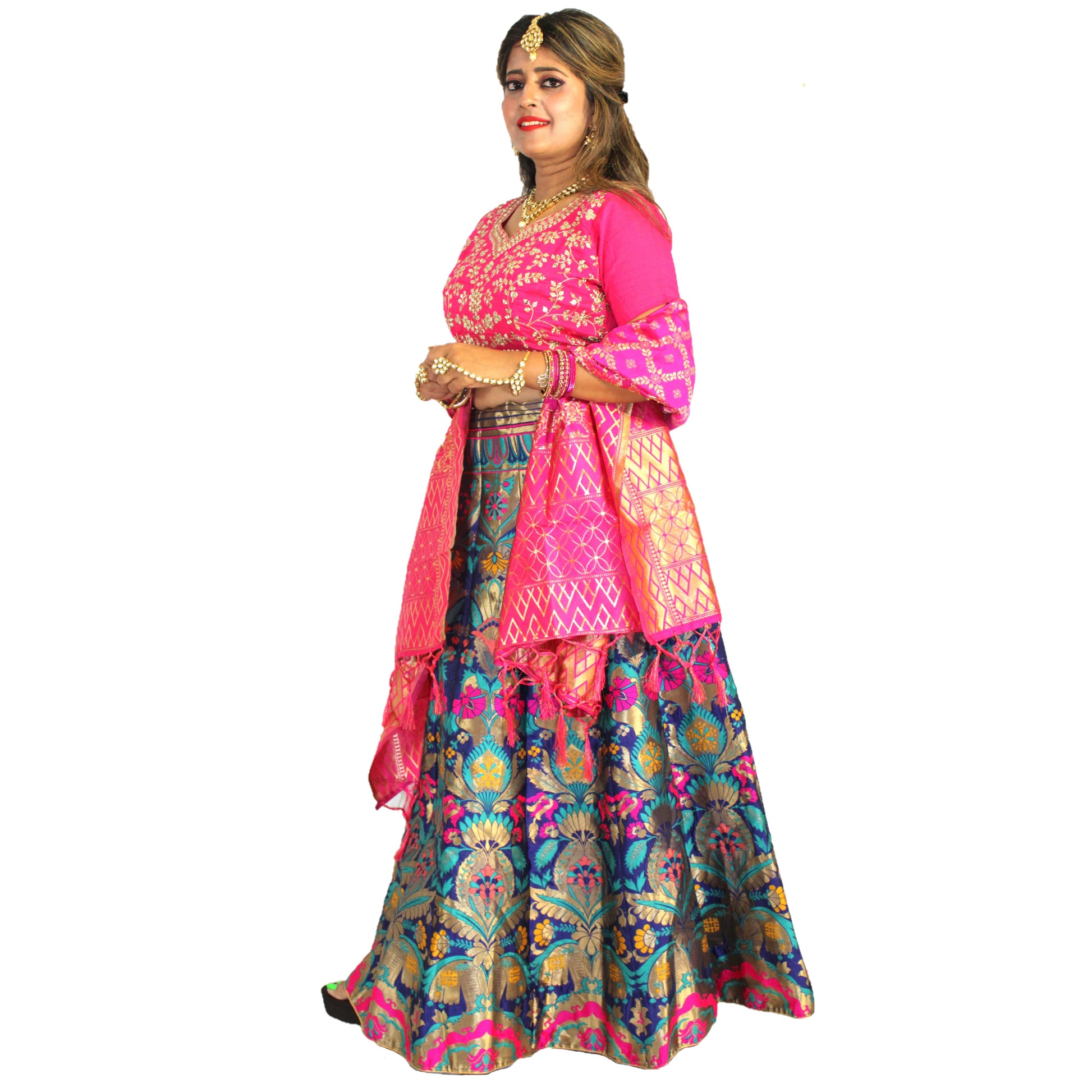 Maharani's Designer Pure Banarasi Silk Lehenga - Pink and Blue (M/L)