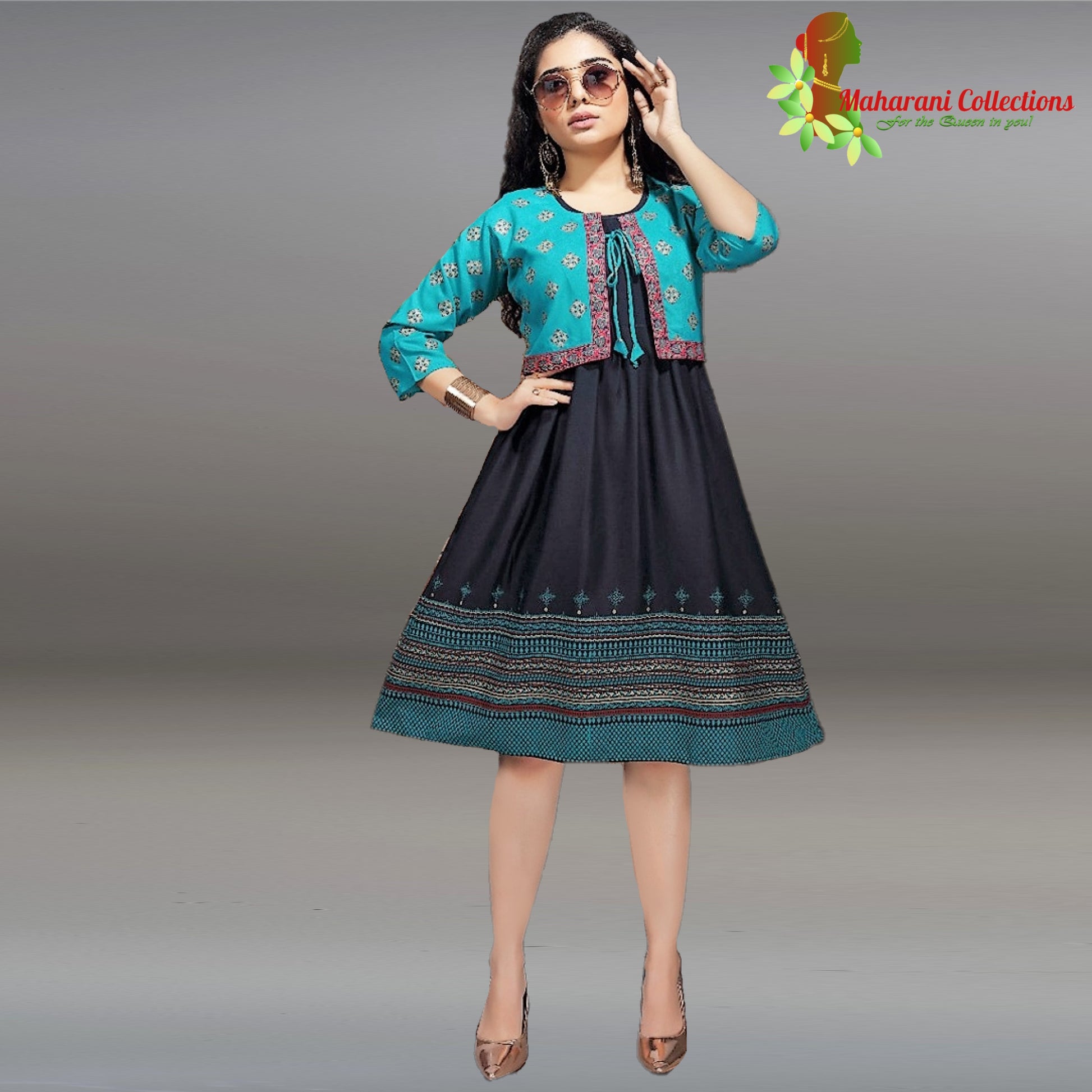 Maharani's designer floral print short dress (Kurti) in soft Cotton and Rayon with Floral Print Jacket.