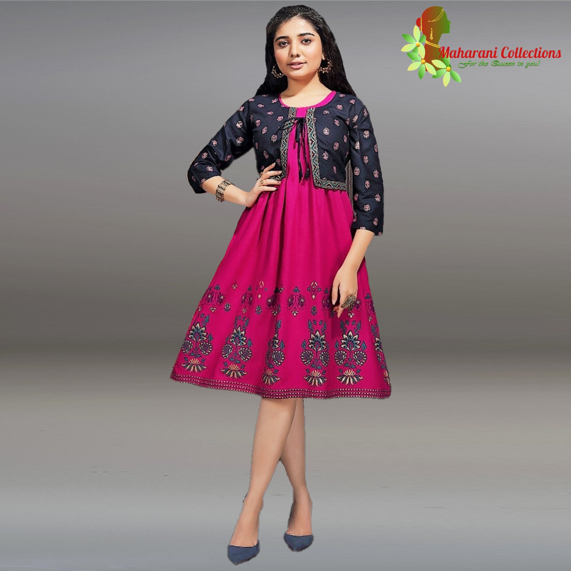 Maharani's designer floral print short dress (Kurti) in soft Cotton and Rayon with Floral Print Jacket.