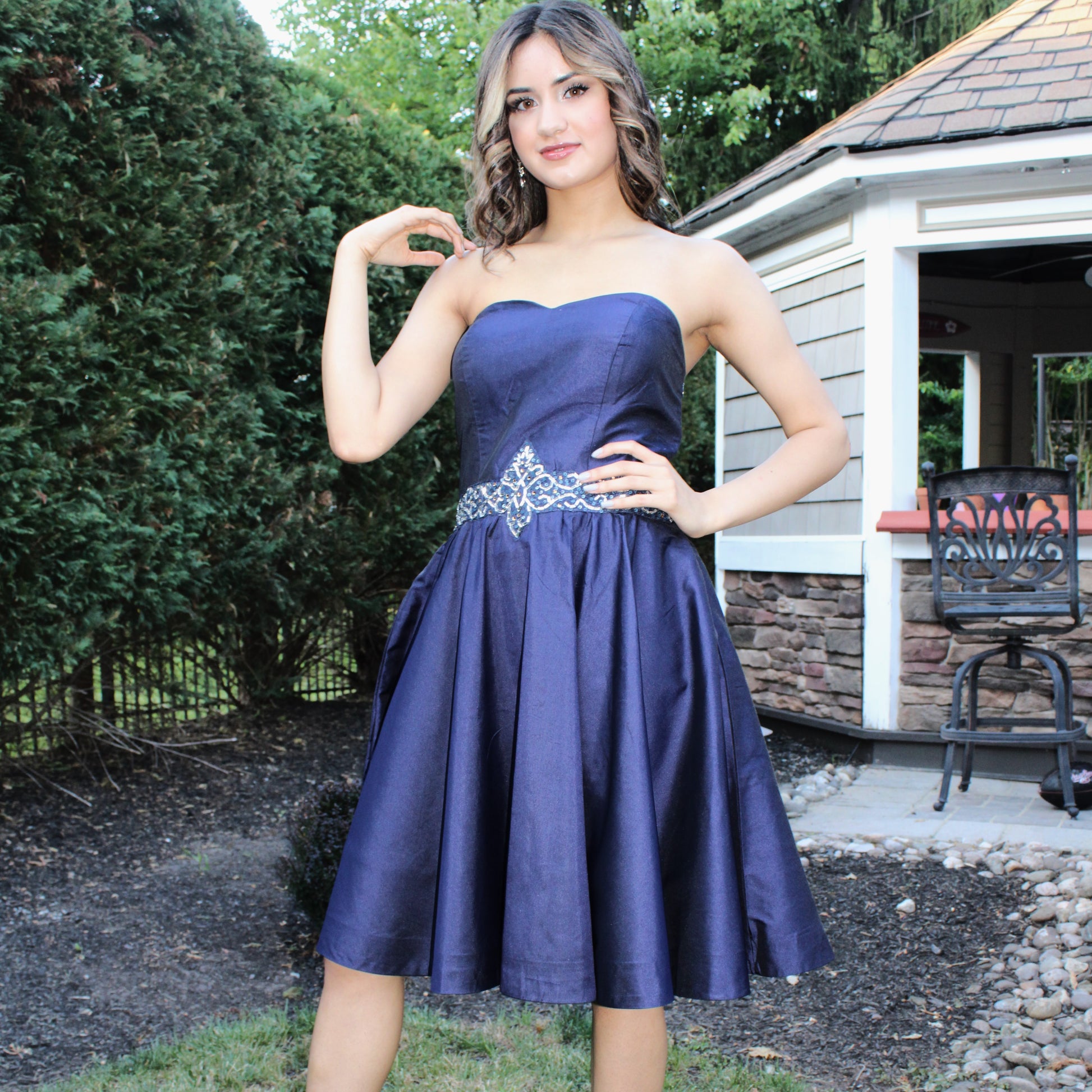 Maharani's finest, designer flared short dress, designed for formal events, comes with Stitched satin lining, sequins and stone work, padded bust and top strapless design.