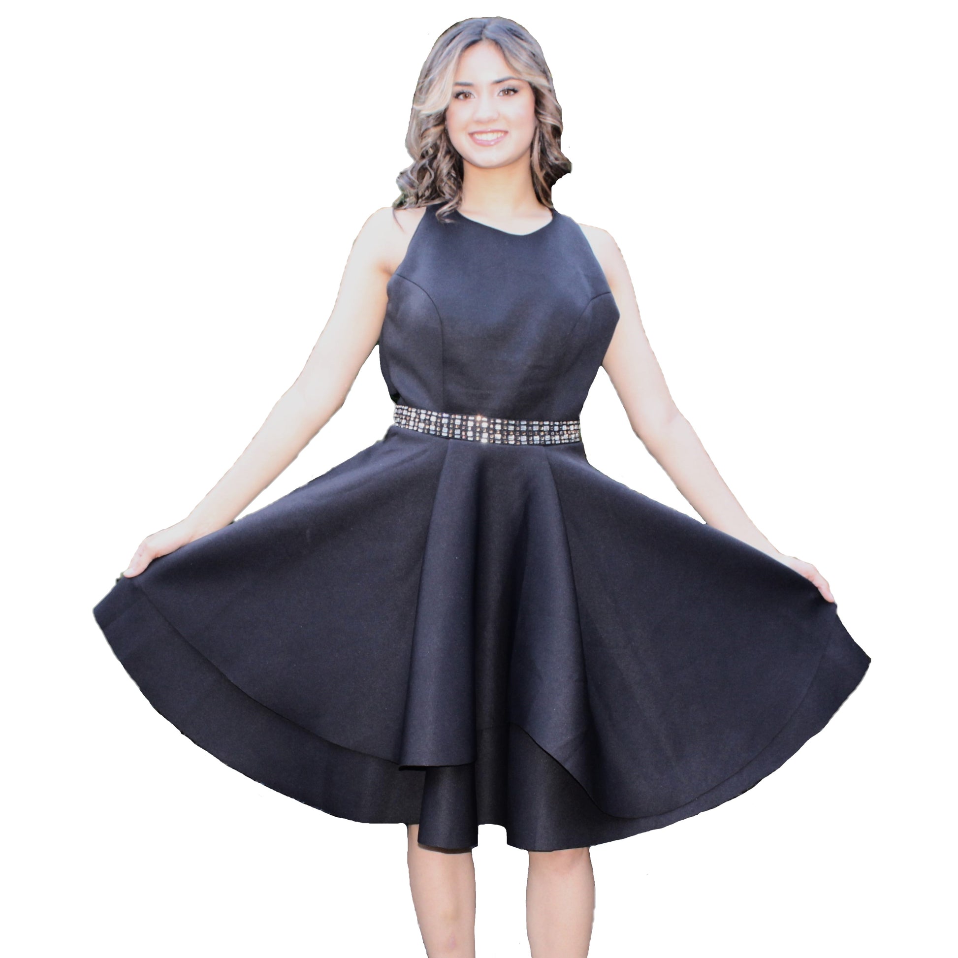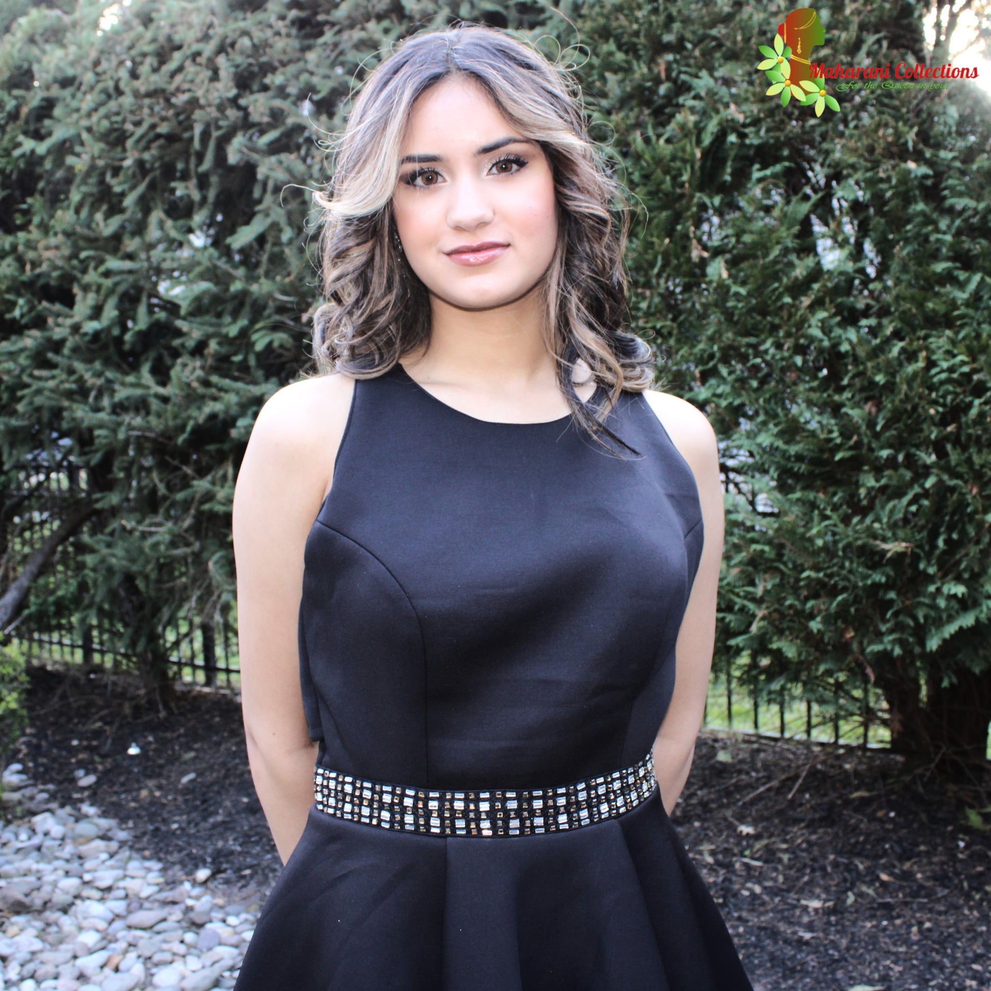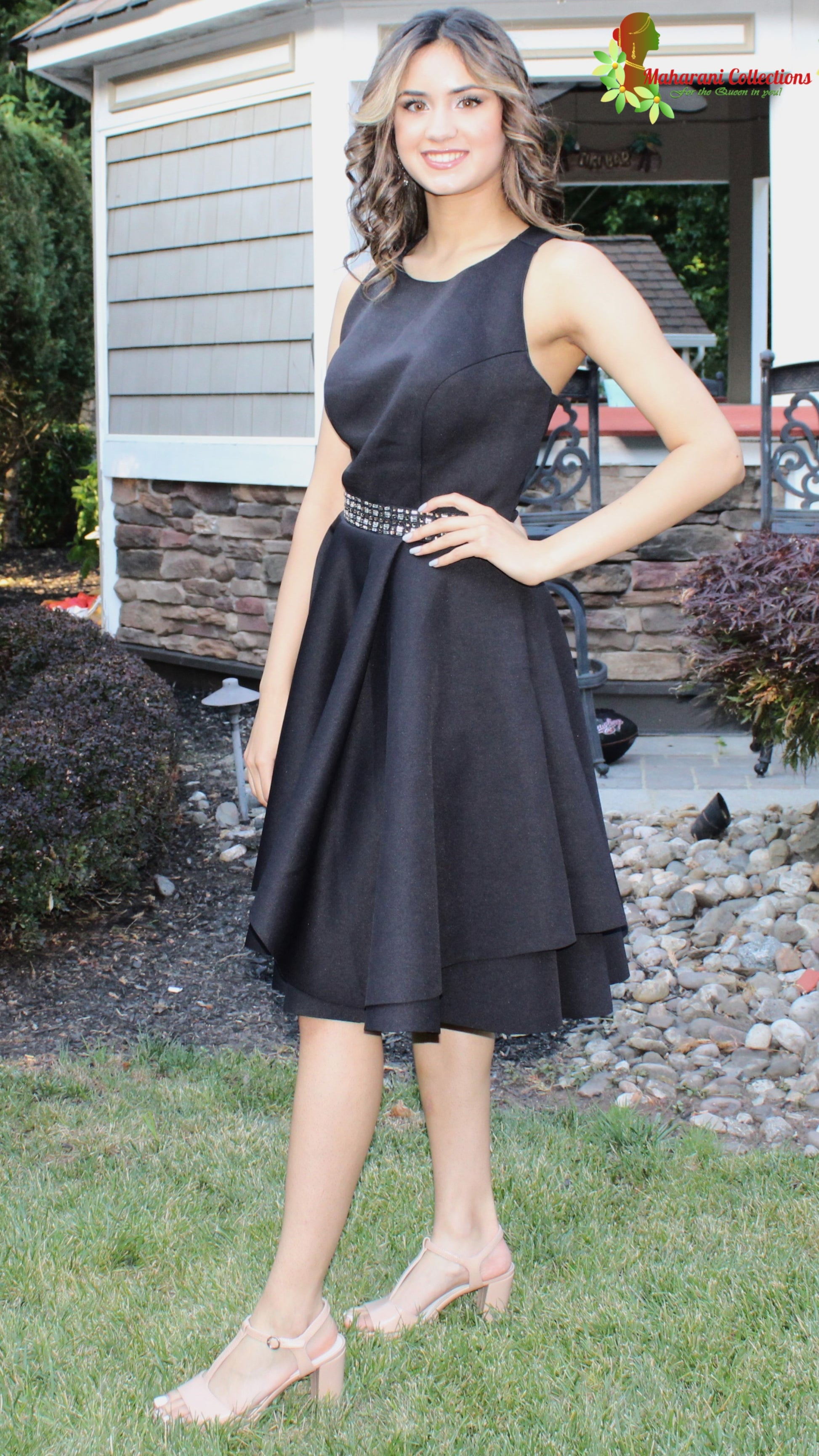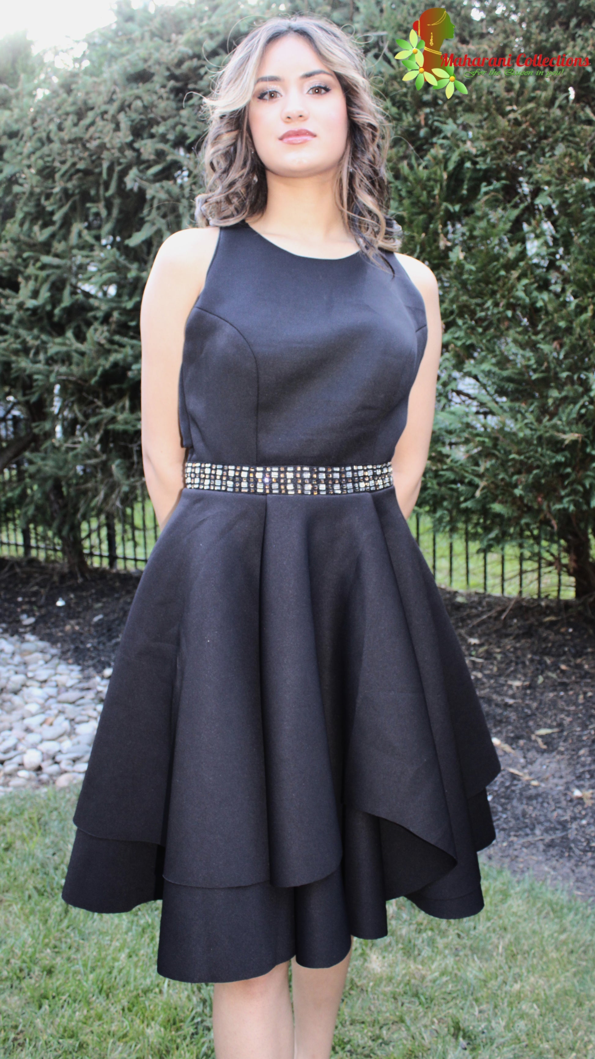Maharani's finest, designer flared short dress, designed for western formal events while presenting the elegance of an Indian princess – a unique blend of best of Indian fashion art and fabric with western design. Detailed thread, net and sequins work.