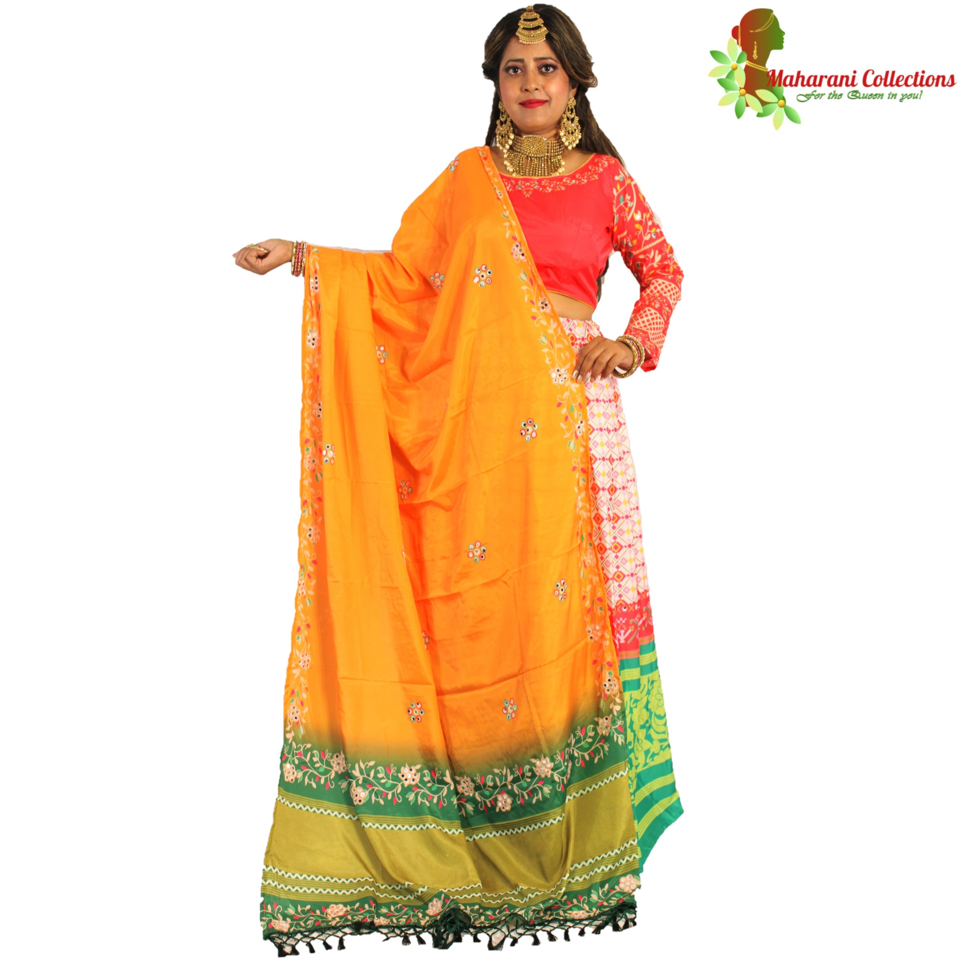 Perfect for special occasions, Maharani's Soft Silk Lehenga with stitched cotton lining is a luxurious choice. You'll love its hand-crafted details like sequins and thread work, along with a stunning mirrorwork choli and stylish tassels on the dupatta. Look and feel beautiful in this special ensemble!