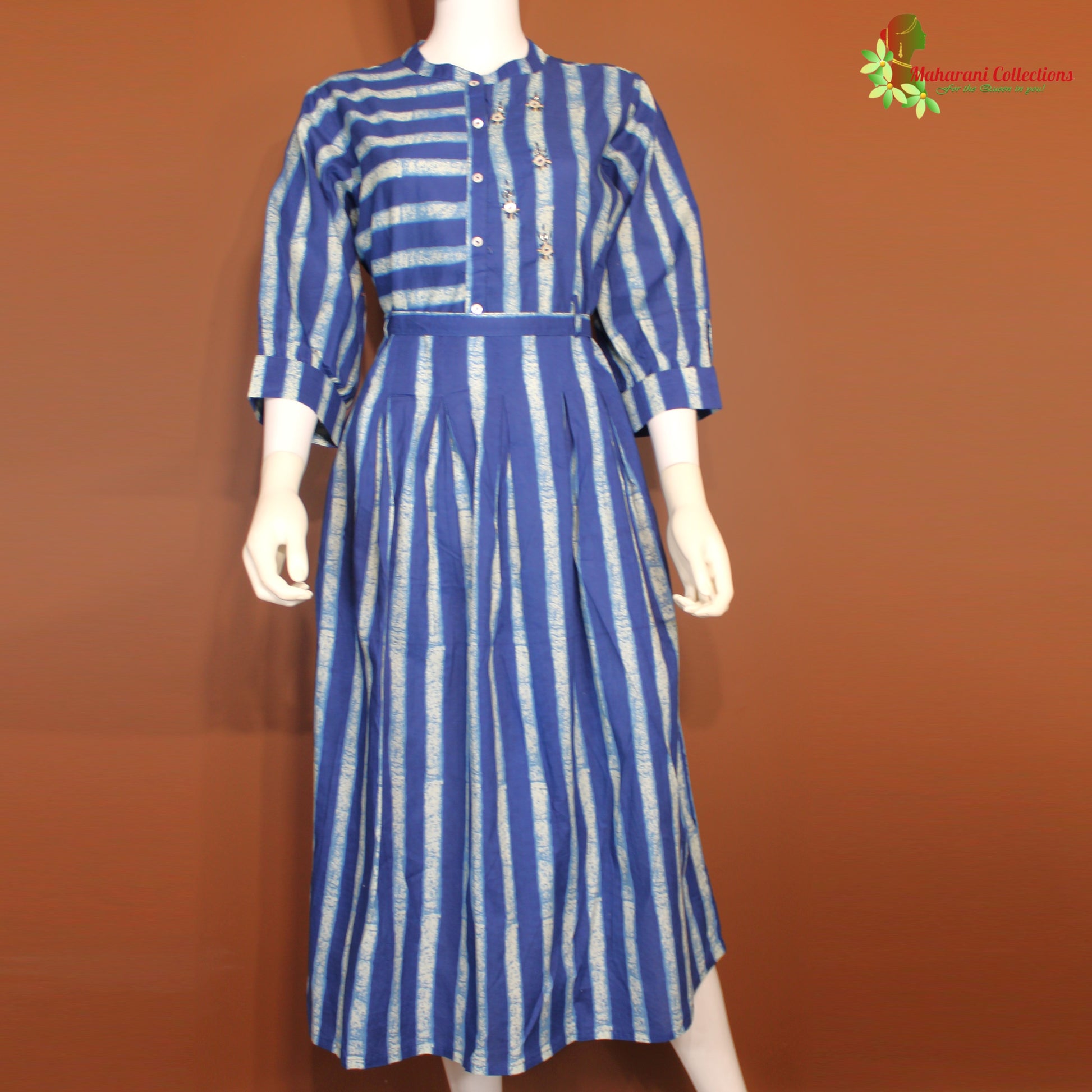 Maharani's Long Dress with Blue and White stripes, includes a handwork belt.